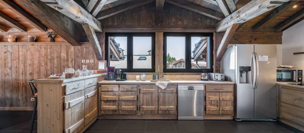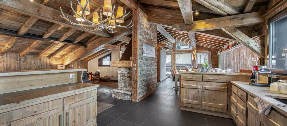 The living area offers a very spacious living room, with a wonderful fireplace and large comfortable sofas, representing ideal surroundings to enjoy a warm moment with your children, friends or family. The fully equipped kitchen, with a traditional atmosphere, opening on to the living room blends perfectly into this warm and spacious living space.