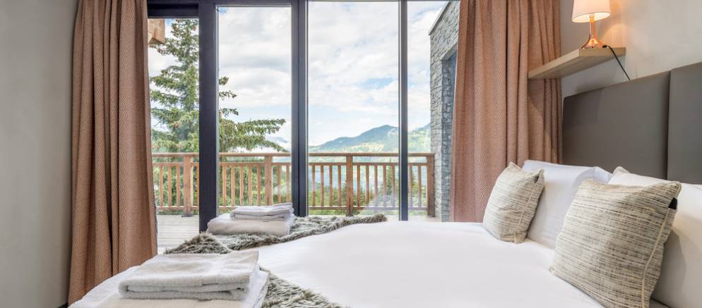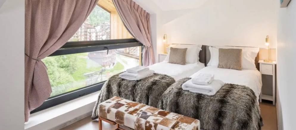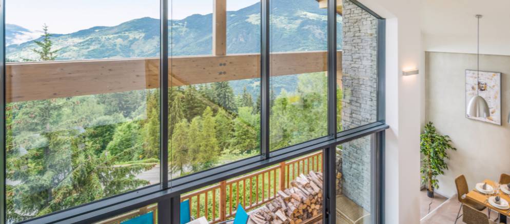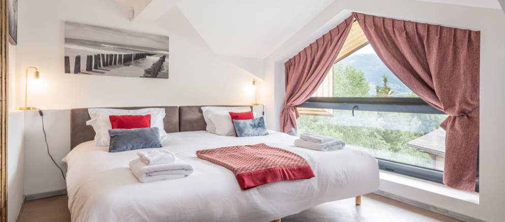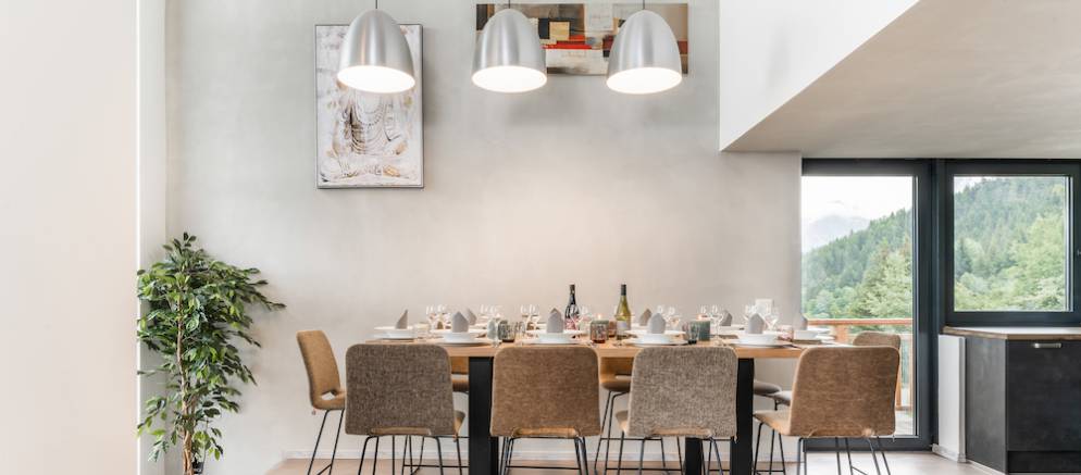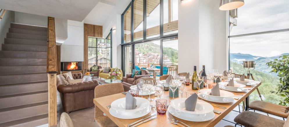 The chalet is arranged over three floors and can accommodate up to 12 guests in 6 bedrooms, all with either double or twin beds. The open plan living and dining room as well as the kitchen are located on the middle floor where a huge double height ceiling and large picture windows afford dramatic views over the resort and mountains.