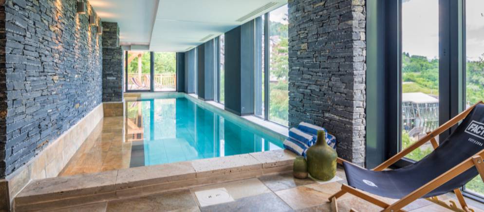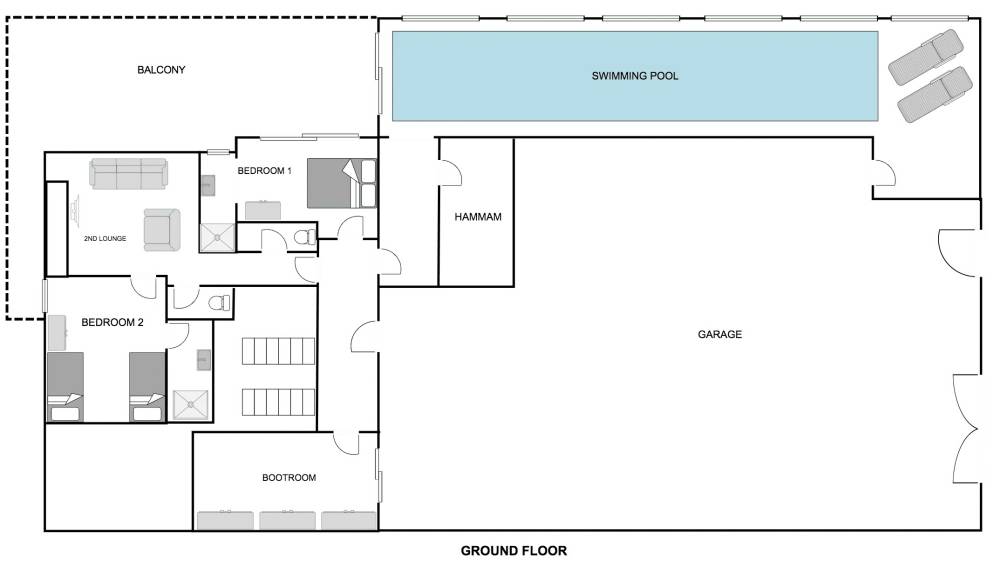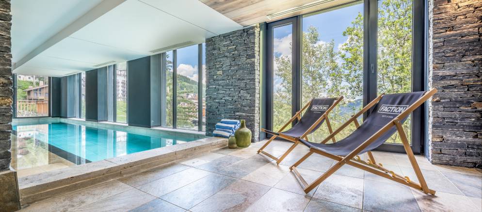 Heading downstairs and the crowning glory of the chalet is discovered with a 10m long indoor swimming pool set against the backdrop of the Alps. After a refreshing dip or some lengths, you can unwind further in the beautifully green tiled hammam. Also on this floor is a second living room / TV room, which is a great additional feature for family groups with children, as well as a kids garage zone with full size pool table, table tennis table & table football.