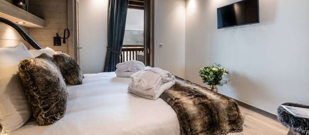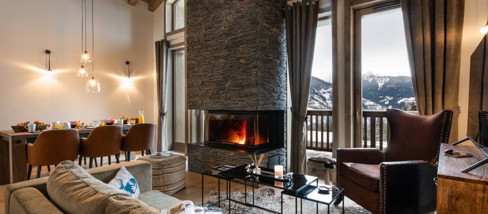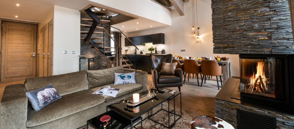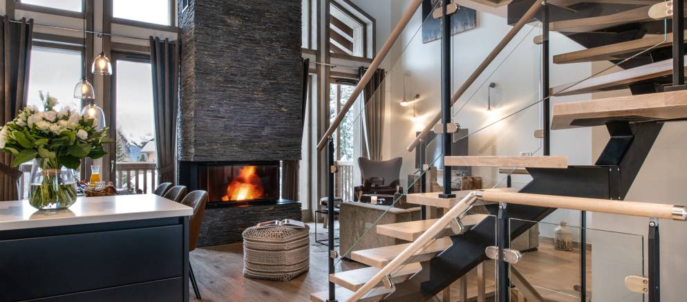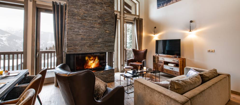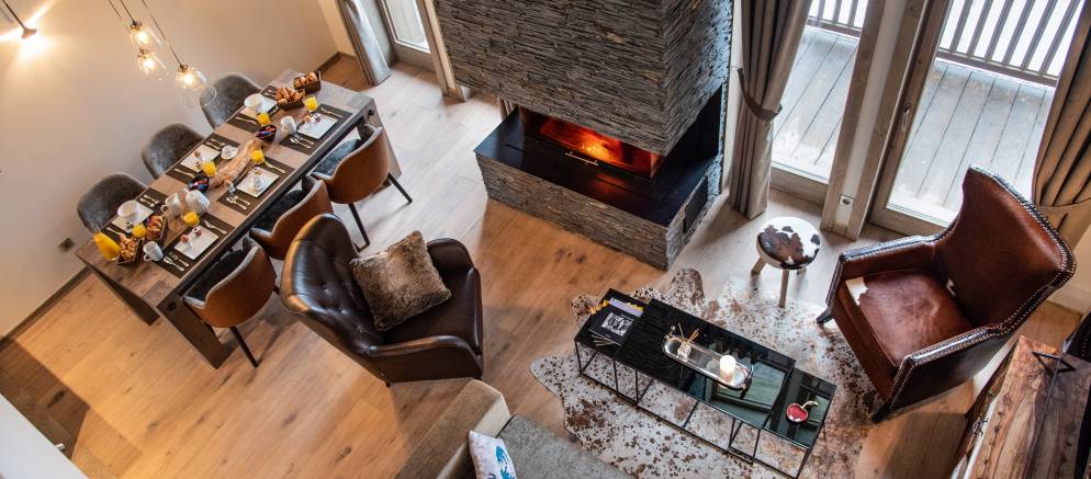 The open plan living space is located on the third floor and benefits from a balcony to the front and terrace to the rear. The lounge and dining rooms are set under the double height ceilings and the picture windows with mountain views and wood burning fireplace all add to the winter ambiance.
