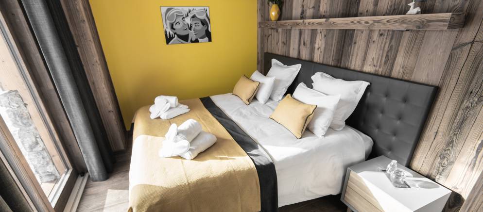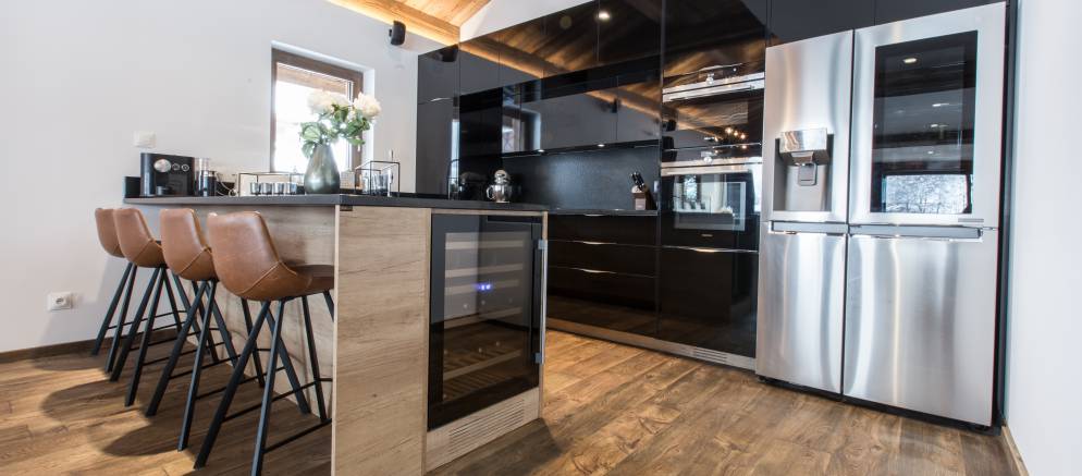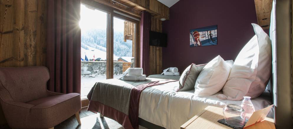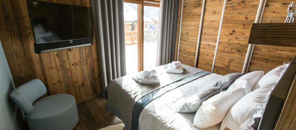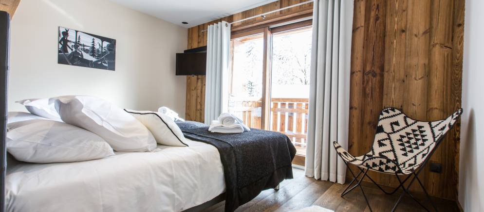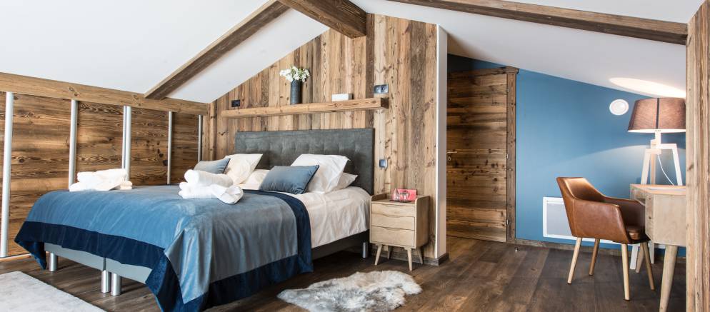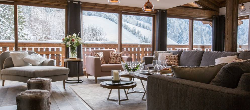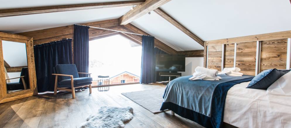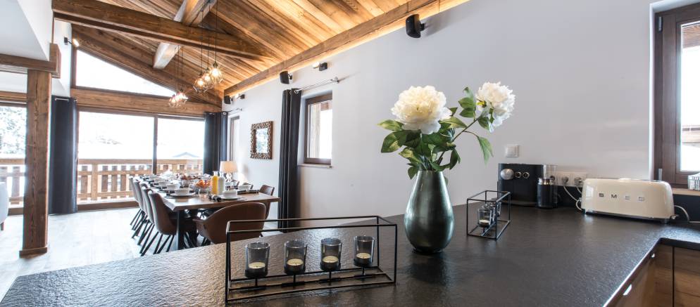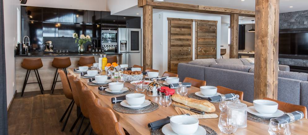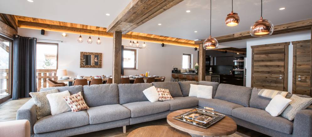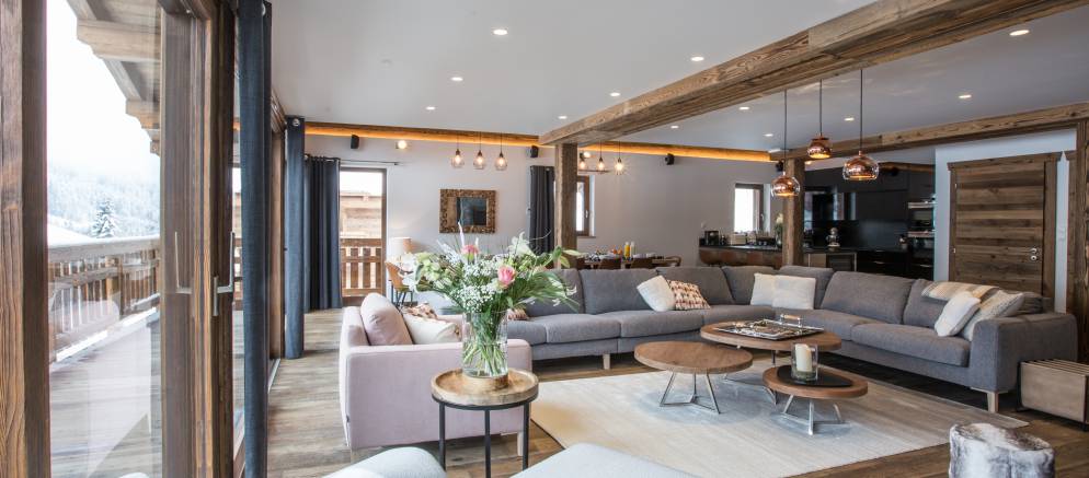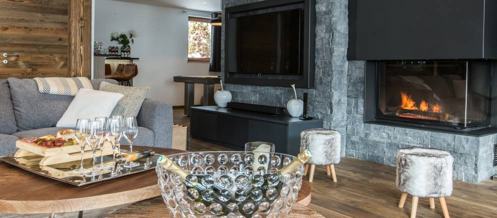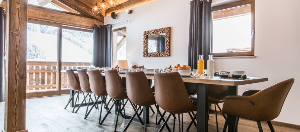 The large and open plan living rooms are at the heart of the chalet and are full of an eclectic array of designer furniture. Large south facing bay windows offer a splendid view of the Perrieres ski slopes which are best enjoyed from a sofa next to the fireplace.