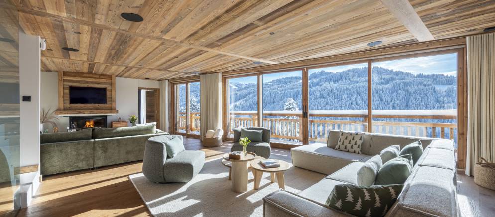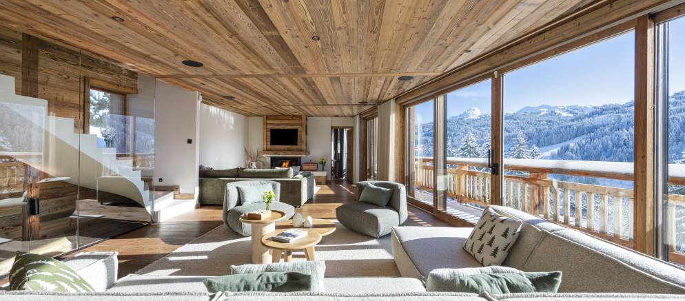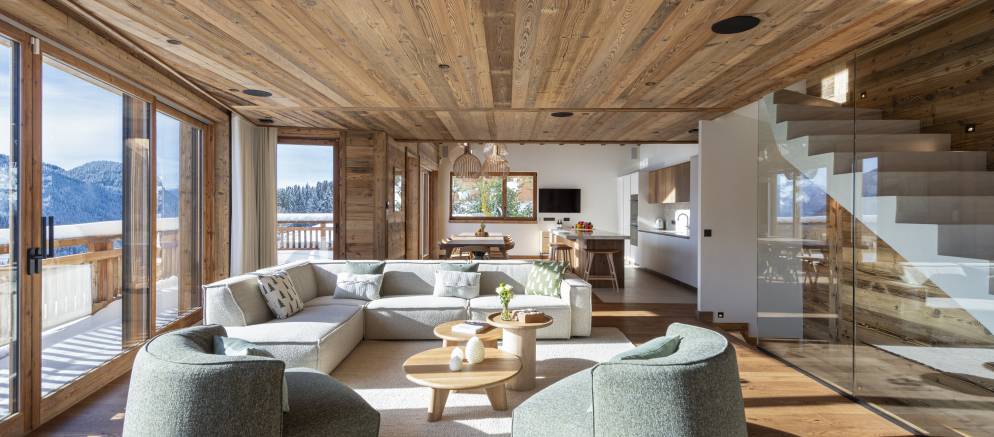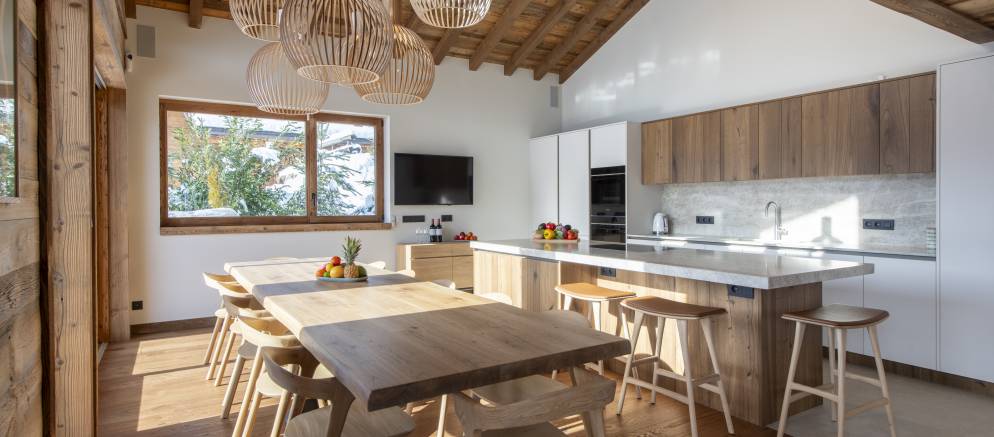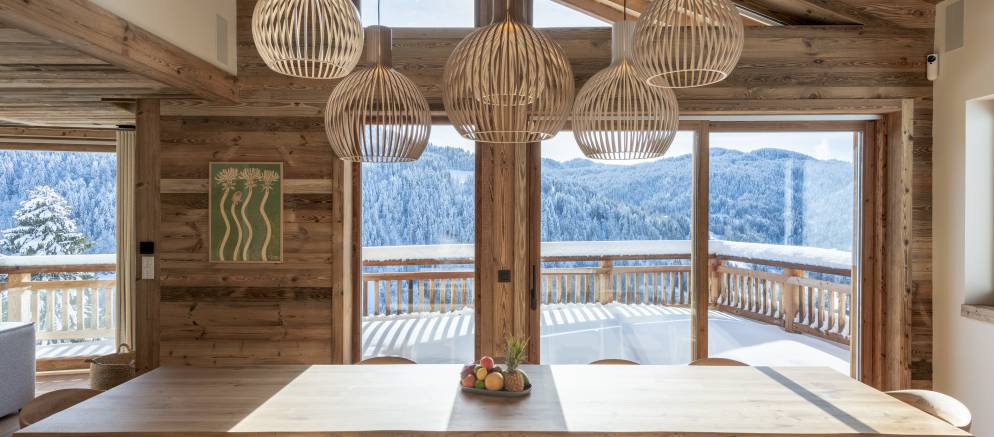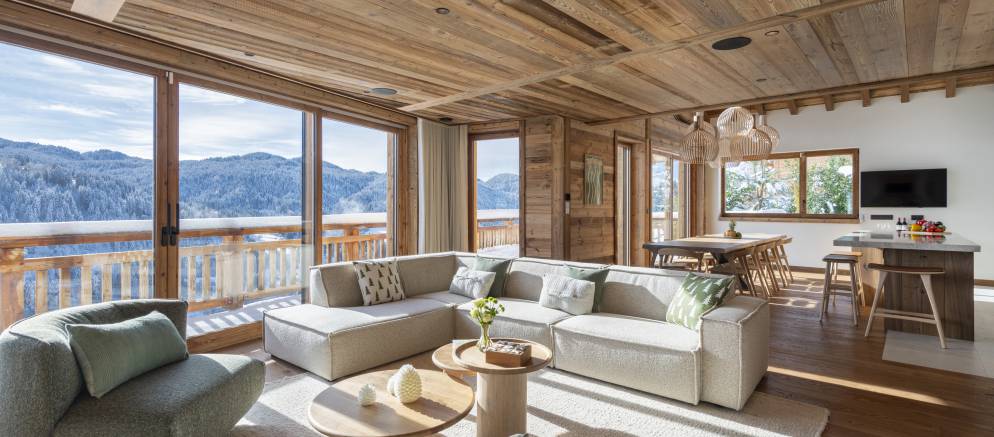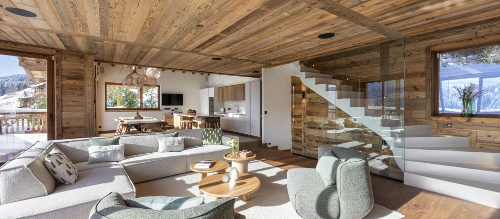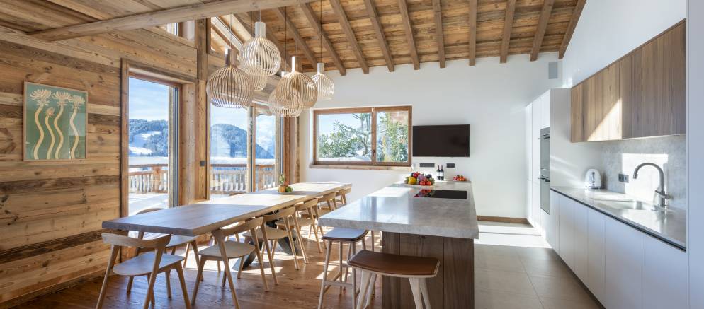 Ascending the stairs to the middle floor and the magnificent location the chalet occupies becomes immediately apparent with the panoramic views beaming through the floor to ceiling windows. The inviting open plan living, kitchen and dining area stretch across the floor offering a relaxed ambiance and plentiful space for your group to spread out into and relax.
