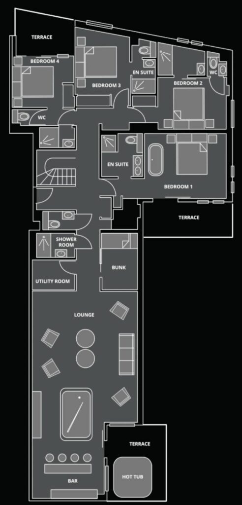Heading upstairs to the top floor of the penthouse and you are greeted with the impressive open plan kitchen, dining and lounge. The large dining table with intricate chandelier above are the perfect setting for evening dinner parties. The kitchen has been designed with self-catering holiday’s in mind and the large pantry room gives ample storage space to groups who are perhaps staying for more than a week.