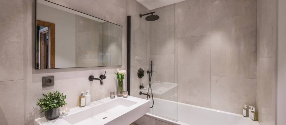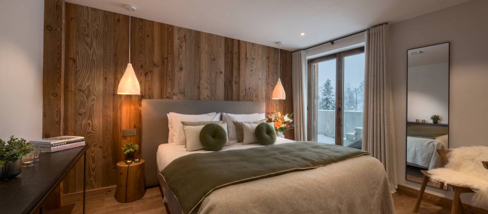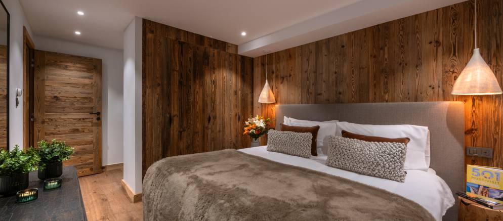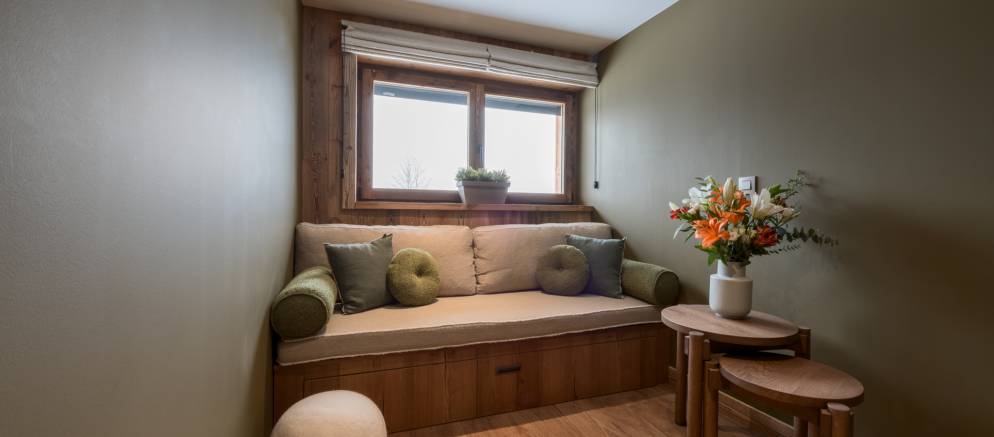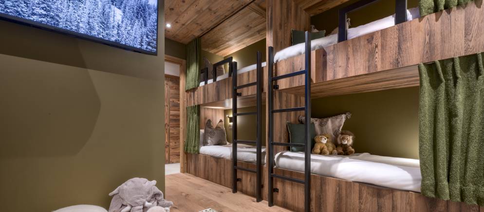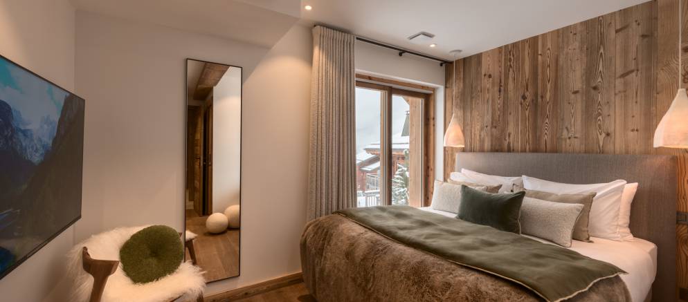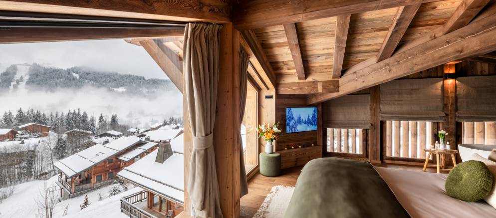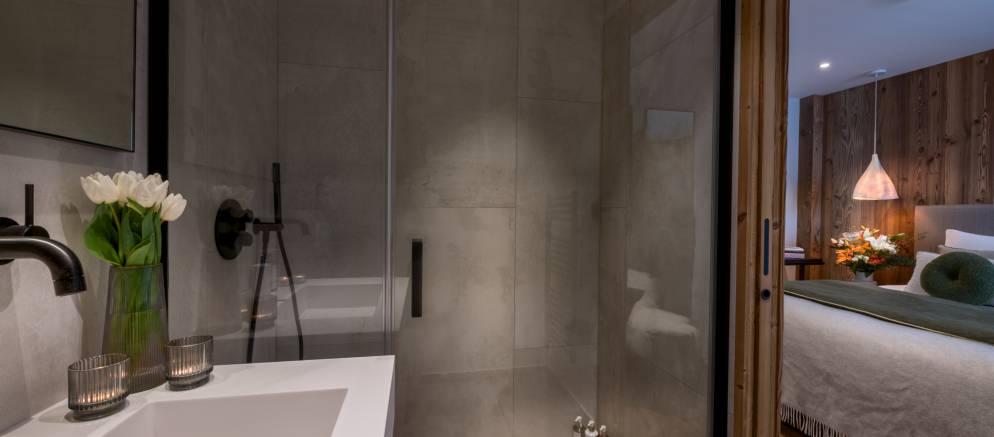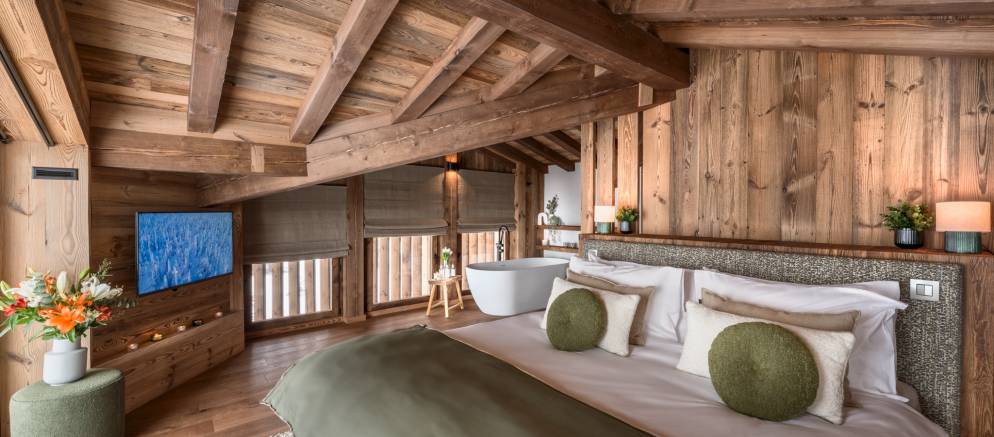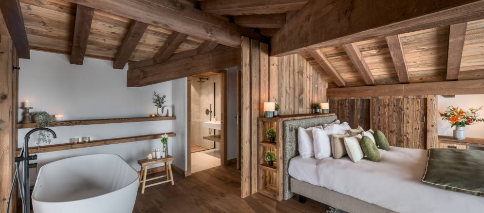 The chalet’s five bedrooms are spread between the top floor and lower two floors. The master suite occupies the whole of the top floor, and the bed is positioned to make the most of the views over Mt Chéry ski slopes. This private sanctuary has its own en-suite shower room and features an egg-shaped bathtub in the bedroom, so you can soak in the bubbles overlooking the mountains.
