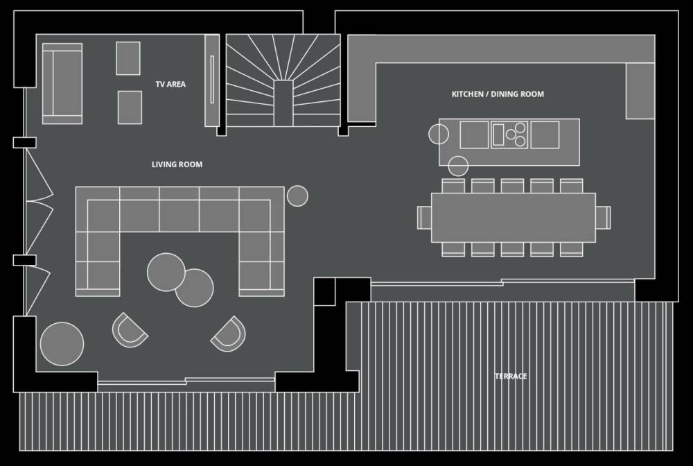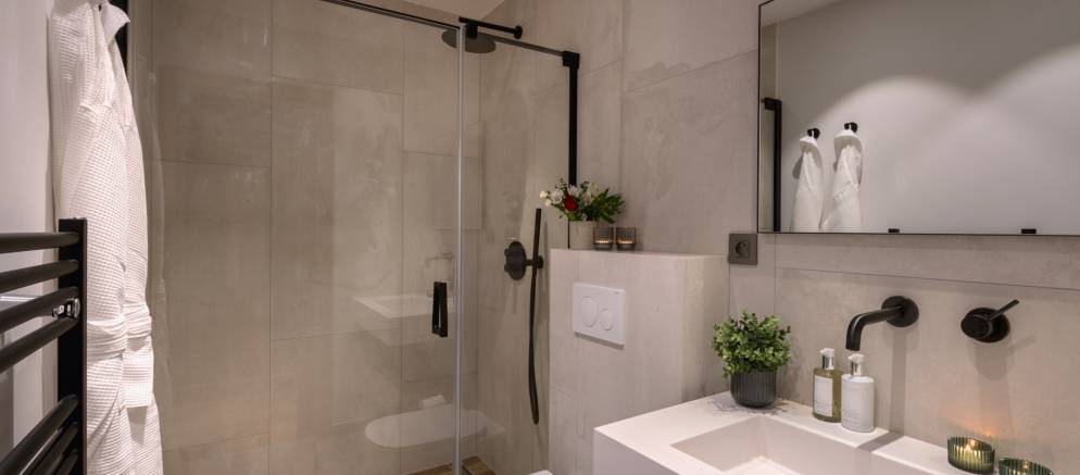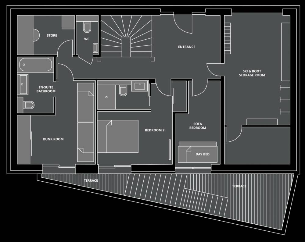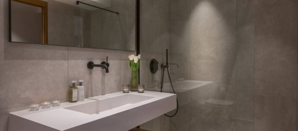 This floor offers two distinct spaces, one for relaxing and the other for cooking and dining. The living room has two separate seating areas, one with a big sofa area for socialising by the wood-burning stove, and a cosy nook for watching TV. The modern kitchen with island unit and breakfast bar overlooks the dining table, which can seat 14 people. Step outside to the wide balcony and you can enjoy the mountain panorama with your morning coffee, or a pre-dinner aperitif.