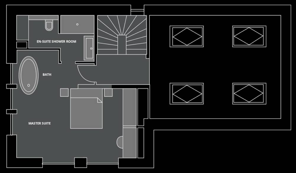 Master suite with super king double or twin beds and en-suite shower room, and a freestanding bathtub in the bedroom.