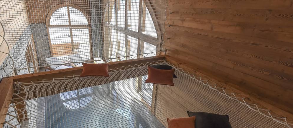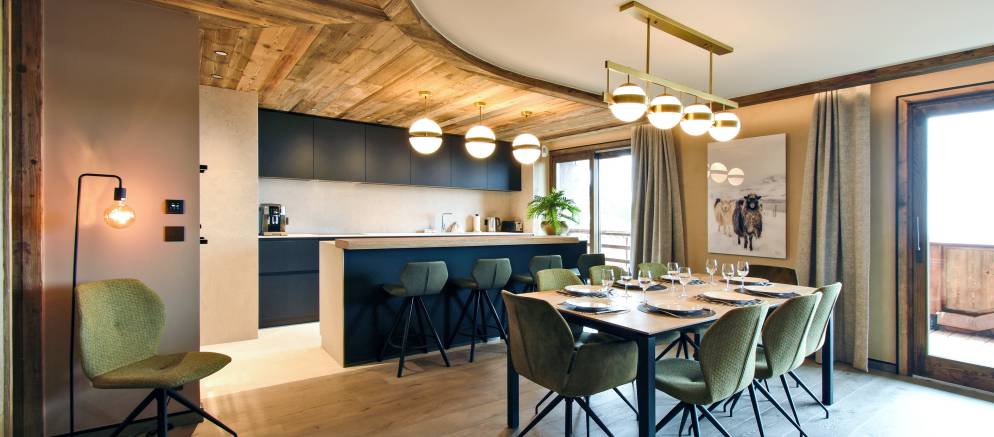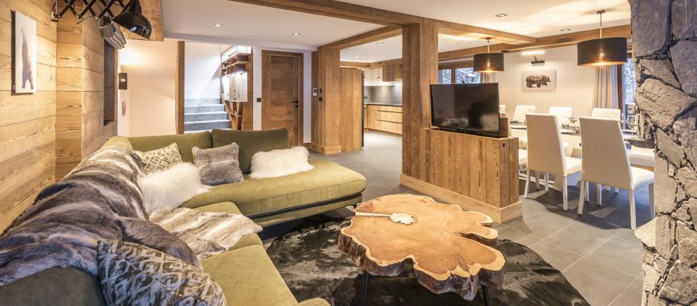 The chalet is arranged over four floors and 265m2 of living space. The magnificent open plan living room of 60m2 features a lounge with fireplace and fully equipped kitchen opening onto the dining room. Step out from here to the large south facing terrace and enjoy the panoramic views of the mountains and ski slopes.