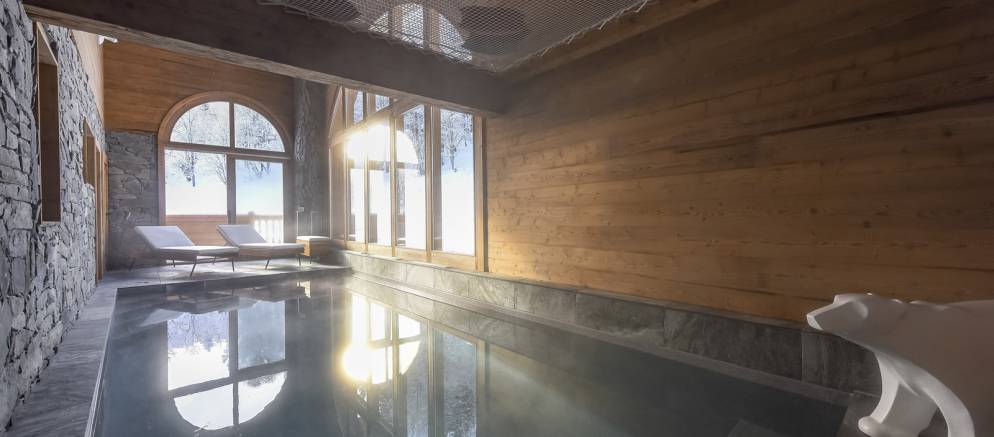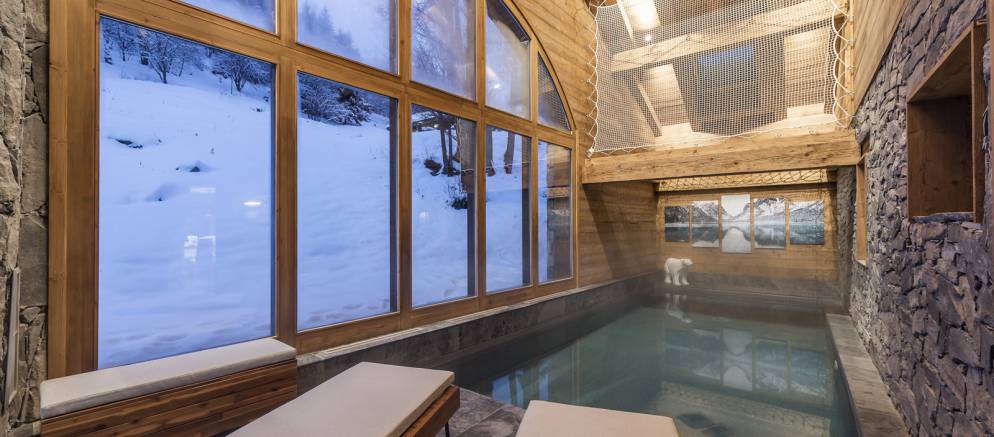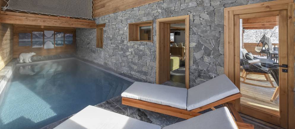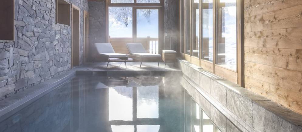 Perhaps the chalets crowning glory is the 7m x 3m indoor swimming pool with double height ceilings and picture windows. Relax on a lounger pool side before taking a dip all the while surrounded by the magnificent snow-covered mountains. Outside on the garden level is also a bubble sauna which will be appreciated by your tired muscles after a days skiing in the 3 valleys.