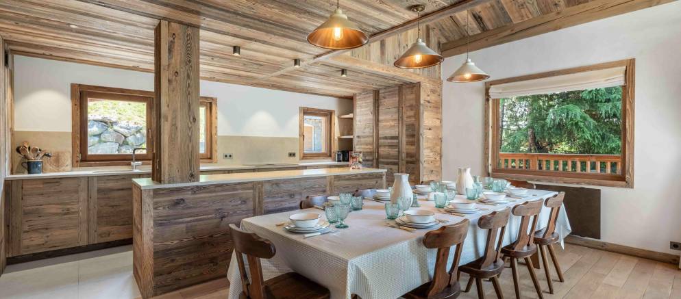 The lounge space is decked out with sofas and armchairs and provides a warm and intimate atmosphere in which to relax in the evenings and plan your next day’s mountain adventures. A wood burning fireplace sits at the centre of this floor and adds warmth and cosiness. Adjacent to the lounge is the first dining table, which is small and perfect for children’s dinners or as a card table.