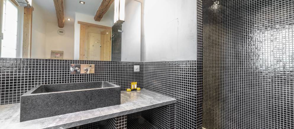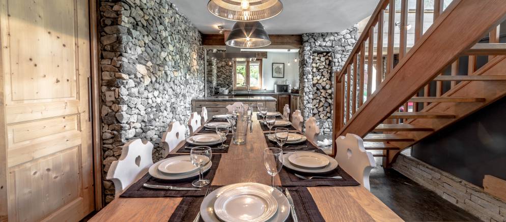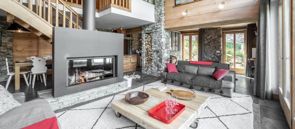 The ground floor features the main living spaces with the living room benefitting from double height ceilings, French windows and a huge wood burning fireplace. This room spills out onto a 60m2 terrace with outdoor hot tub and terrific mountain views. The dining table comfortably seats 10 and is adjacent to the kitchen.