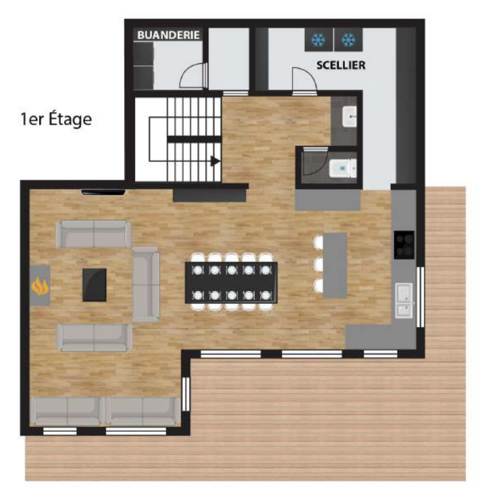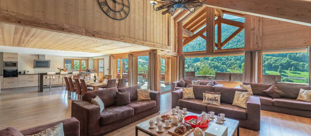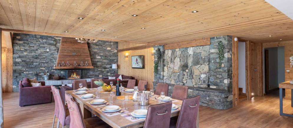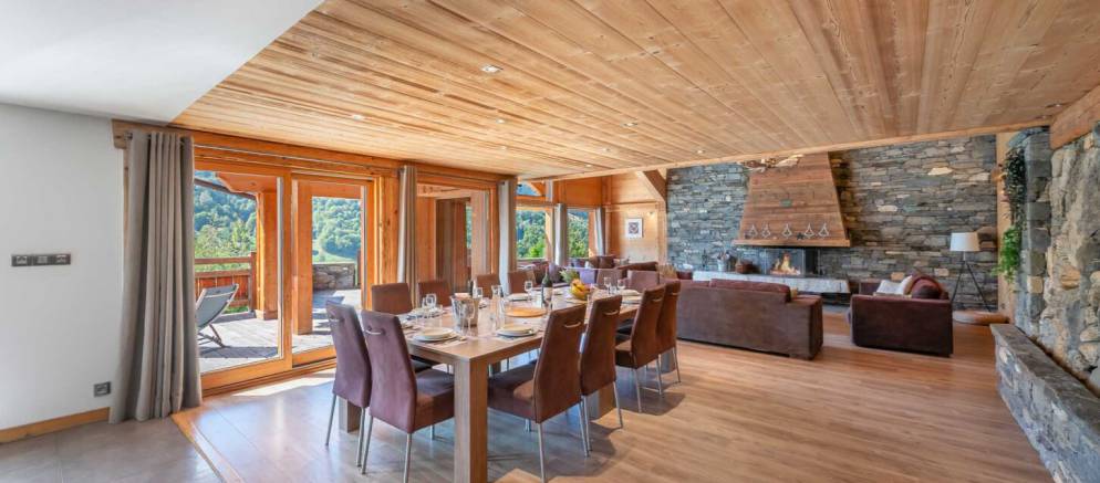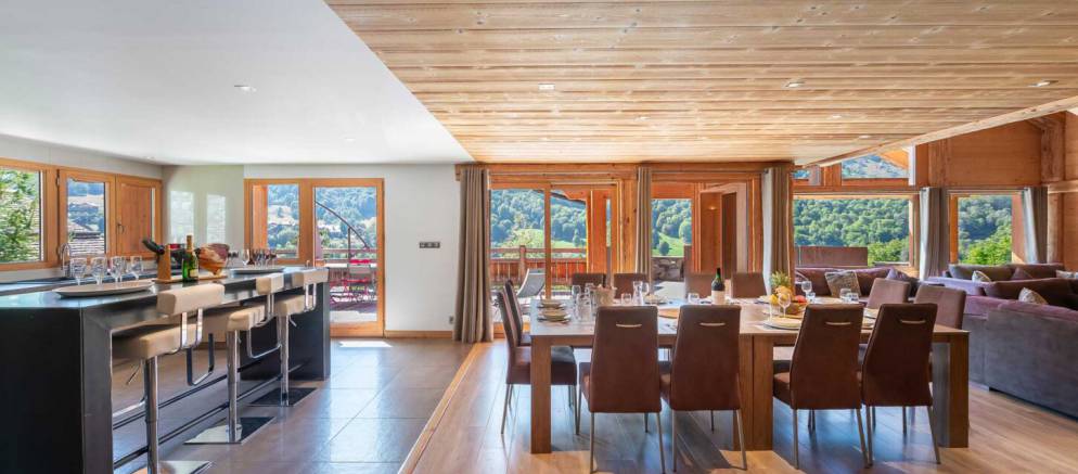 The open plan living rooms are spread across the first floor. To one side is the lounge area with high ceilings, numerous sofas, and a grand fireplace. The large dining table sits at the heart of this level and seats 12, and the modern kitchen with island / breakfast bar is adjacent. Doors open out onto a wide terrace with views across the Meribel valley.