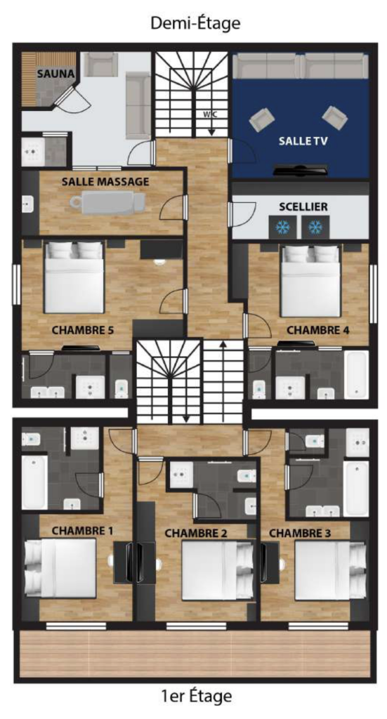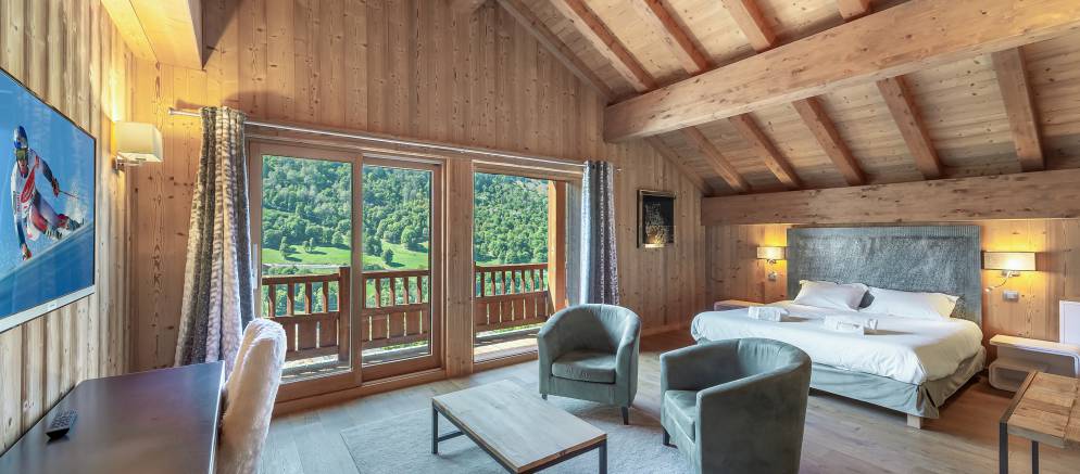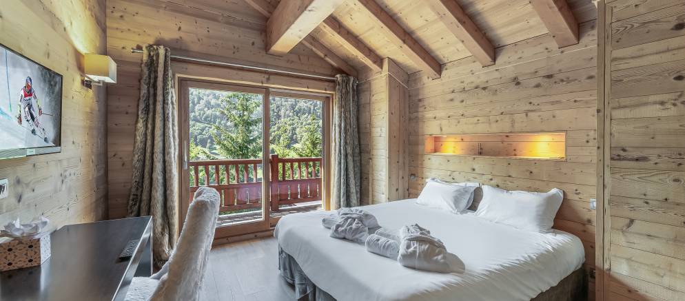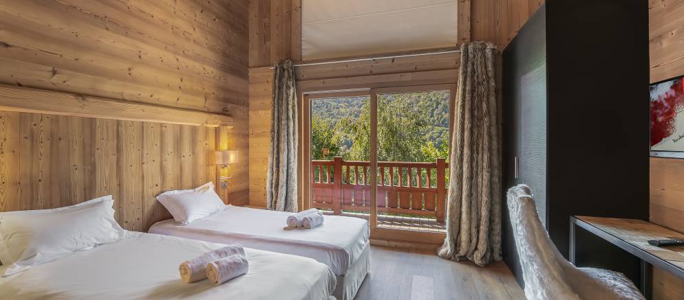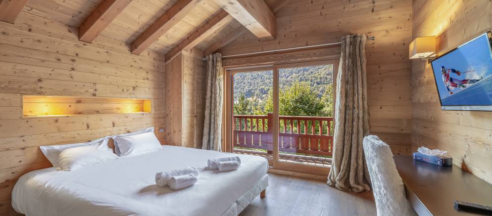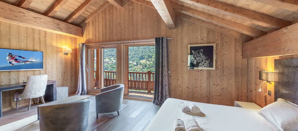 Sleeping up to 12 guests there are six twin/double en-suite bedrooms. The first floor is split into two half levels and at the front of the chalet there are three bedrooms all with access to a wide balcony. To the back of this floor are a further two bedrooms, one with access to a terrace. The final bedroom is on the third floor, tucked away in privacy and with its own balcony.