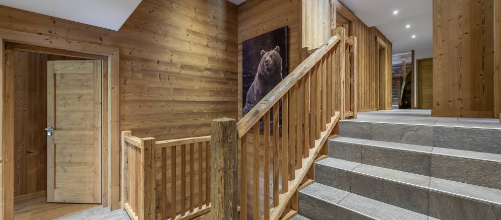 The chalet is arranged over four floors and 400m2 of floor area. The entrance to the chalet is on the ground level where there is a garage with parking for two cars, as well as an entrance lobby and separate ski room. From here stairs lead up to the next three floors, with the bedrooms and entertainment facilities on the first and third floors, and the living rooms on the second floor.