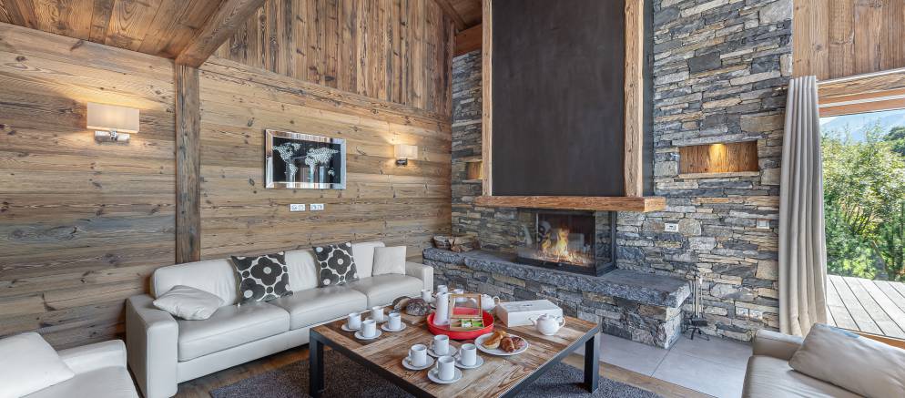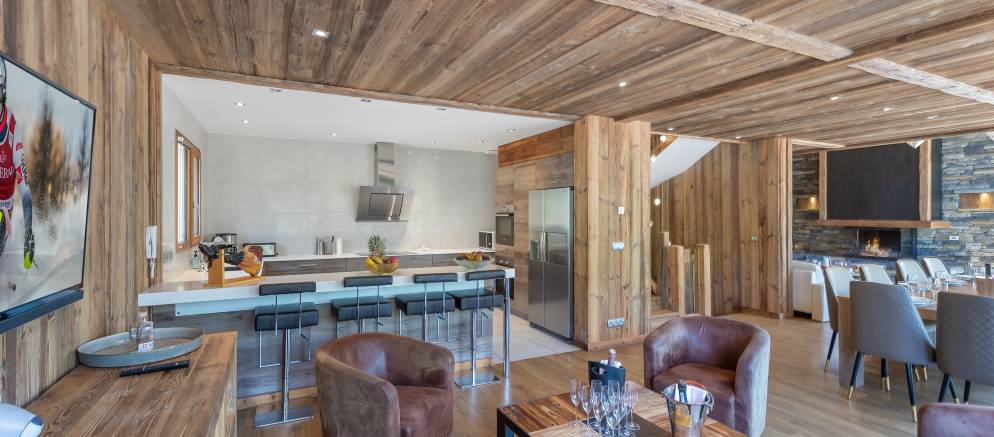 The open plan living spaces occupy the whole of the second floor. This space is filled with natural light from the large picture windows that open onto a large balcony. There is a lounge area with sofas and fireplace, as well as a separate seating area with TV. The dining table sits at the heart of this level and seats 12. The semi-open kitchen with breakfast bar is fully equipped for home cooking.