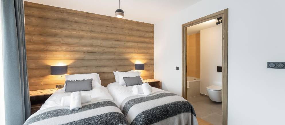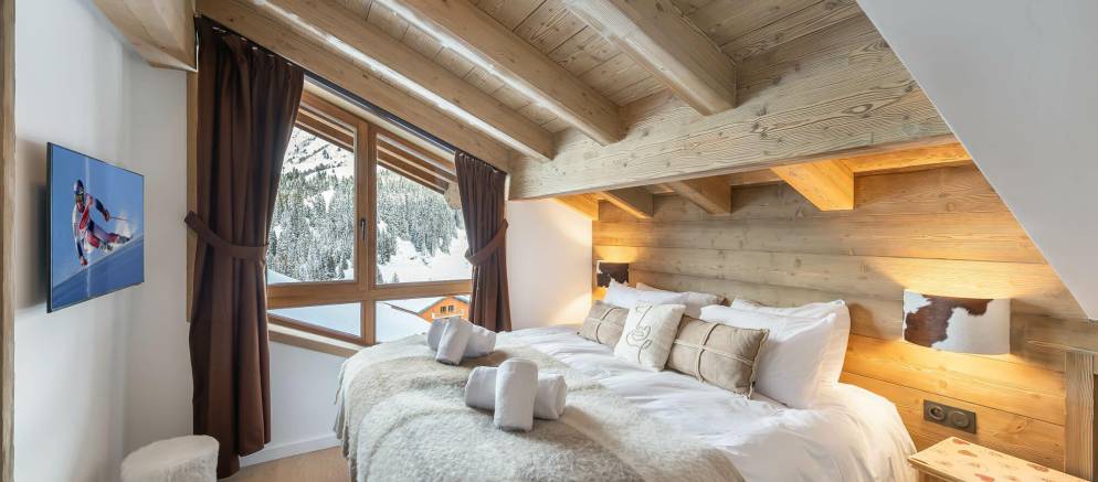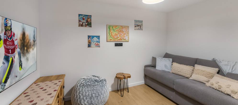 The en-suite bedrooms are spread throughout the chalet with the one bedroom on the entrance level, two on the first floor and one on the top floor. The fifth room is a cabin room on the first floor and has a sofa bed that can accommodate two guests. When not setup as a bedroom, this room works as a separate TV room that is a great feature for any family groups with young children.