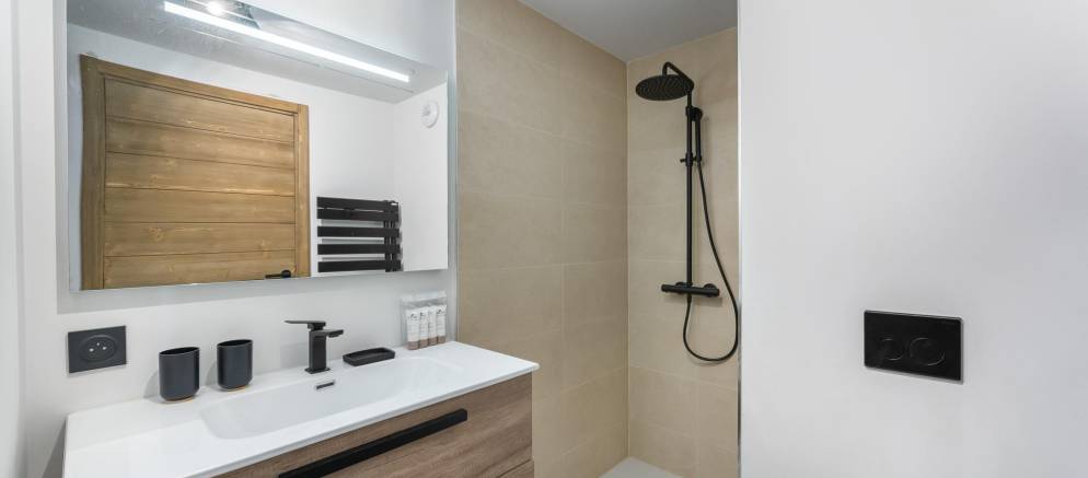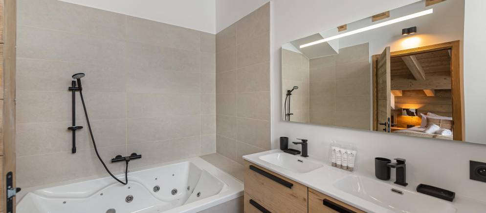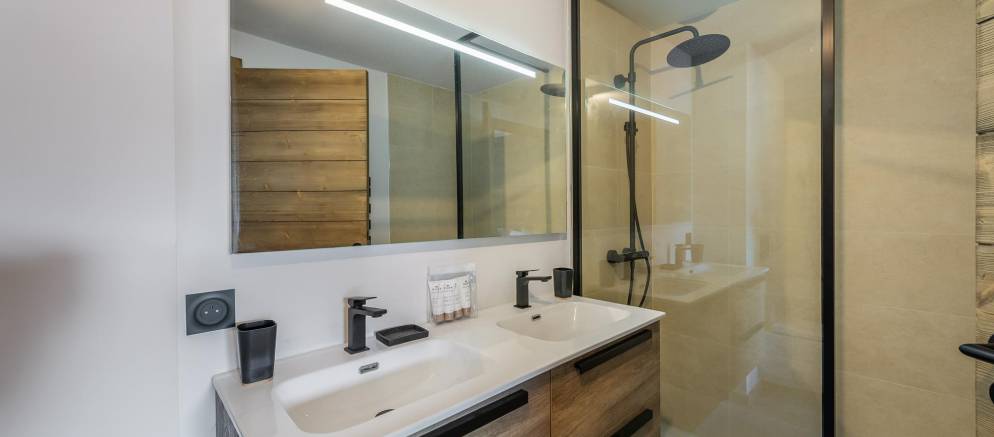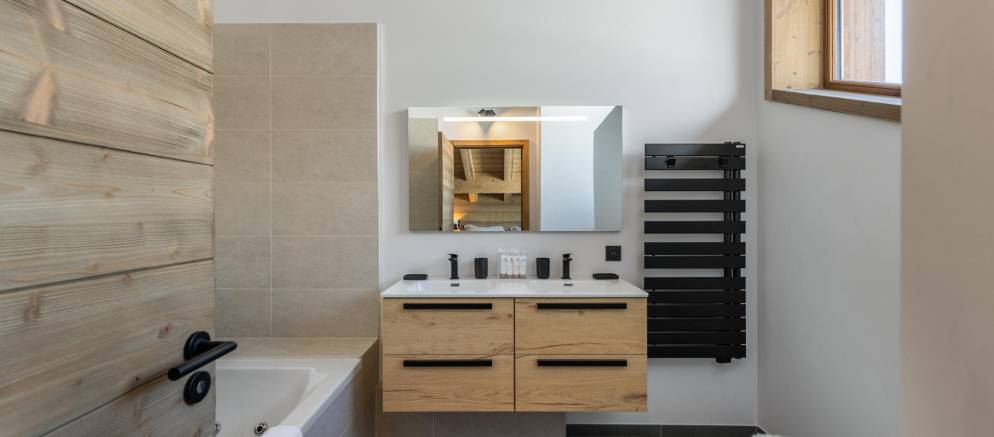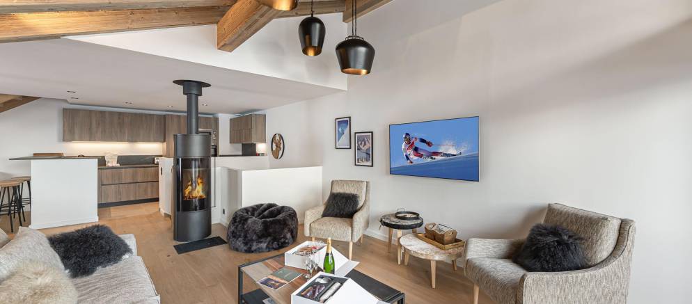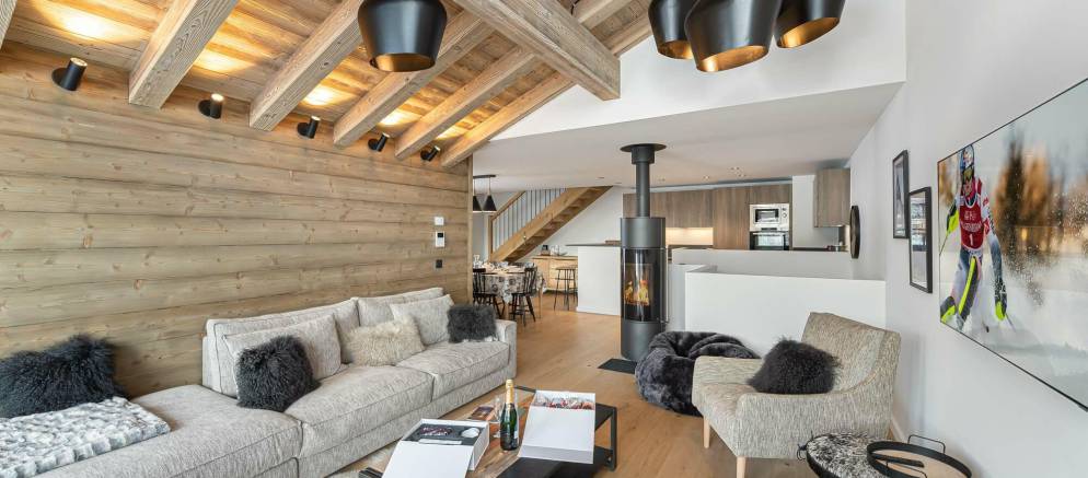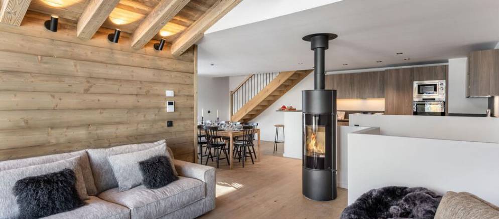 The chalet is arranged over four floors and 150m2 of floor space and can accommodate up to 10 people in four en-suite bedrooms and a cabin room. The spacious open plan living rooms are spread across the second floor and have a refined and contemporary style. The living room has a wood burning stove and panoramic views out over the resort and ski slopes below the Saulire mountain.