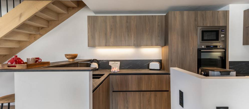 There is plentiful comfy seating and a large flatscreen TV for cosy nights in. The dining room is located to the side of the lounge area and the table comfortably seats 10 people. The open kitchen overlooks both the dining table and living room to create a very convivial space that all the group can enjoy together.