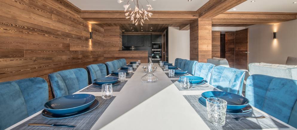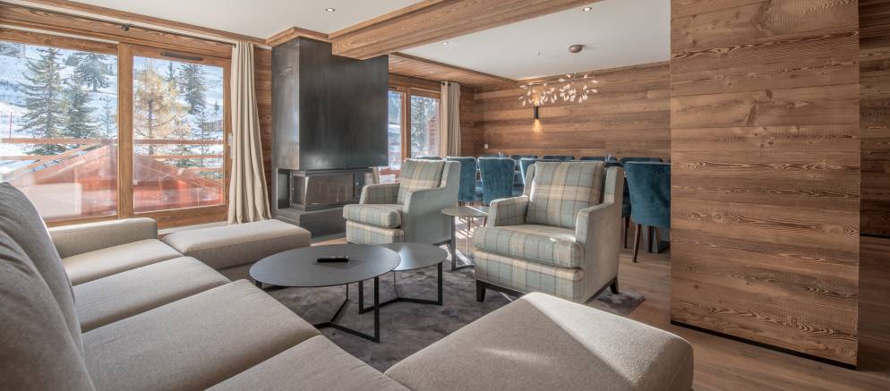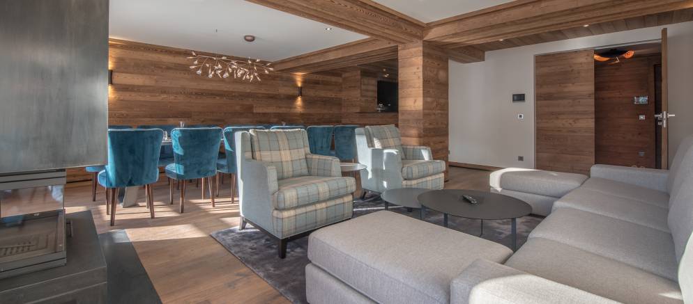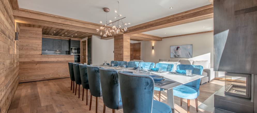 The apartment is arranged over one floor, 150m2 of living space and sleeps up to 12 people. The open plan living spaces featuring wood panelling and a central fireplace. The lounge has comfy seating and the dining room an elegant dining table seating 12. The well-equipped kitchen overlooks this space. There are four double bedrooms sharing two bathrooms and a quad bunk room with en-suite. The property comes with 2 covered car parking spaces.