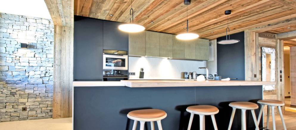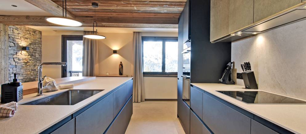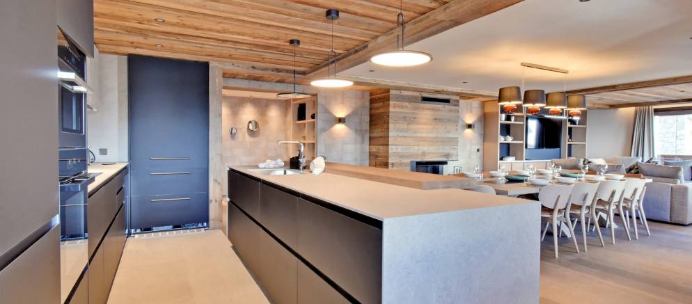 The stylish open plan living spaces are at the heart of this property and feature large picture windows that lead out onto a wide balcony where you can enjoy views over the ski slopes. The living room has large comfy sofas and a large TV. The dining table, which faces the fireplace, comfortably seats 12, whilst the adjoining well-equipped kitchen features a breakfast bar with further seating for four.