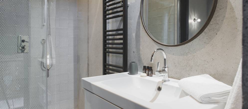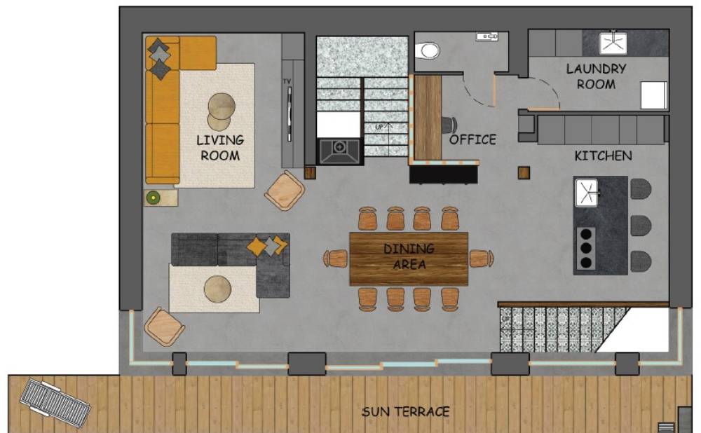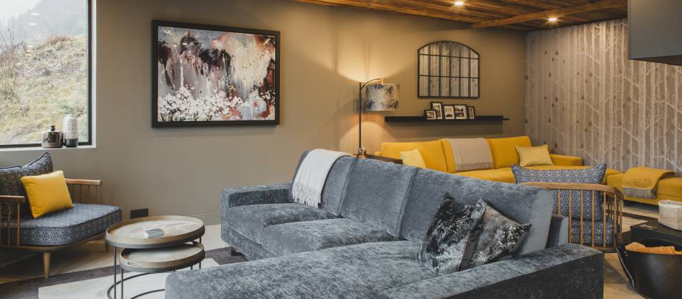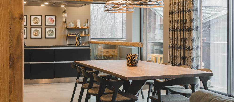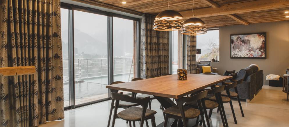 Arranged over three floors the chalet can accommodate 10 guests in five en-suite bedrooms. The middle floor is given over to the open plan living spaces and is the heart of the chalet. With polished concrete floors, impressive floor to ceiling windows and contemporary furniture, the interior offers the best of modern alpine living. The large terrace with outdoor furniture is the perfect spot to enjoy the view.