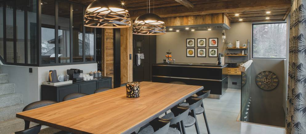 The modern and fully equipped kitchen features a central island and the large dining table enjoys a mountain backdrop. A glass fronted fireplace creates a cosy ambiance, and the large TV and Sonos sound system provide plenty of entertainment. A tucked away workspace, guest toilet and laundry room are all helpful facilities. An outdoor hot tub and fire pit were added for the 2020/21 winter ski season.
