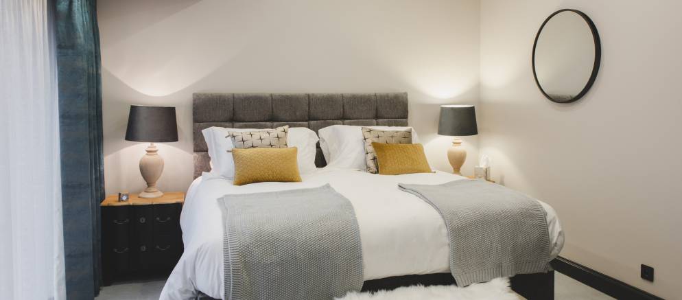 Super king-size double or twin bed with en-suite bath and shower room. Additional two pull out children’s beds if required.