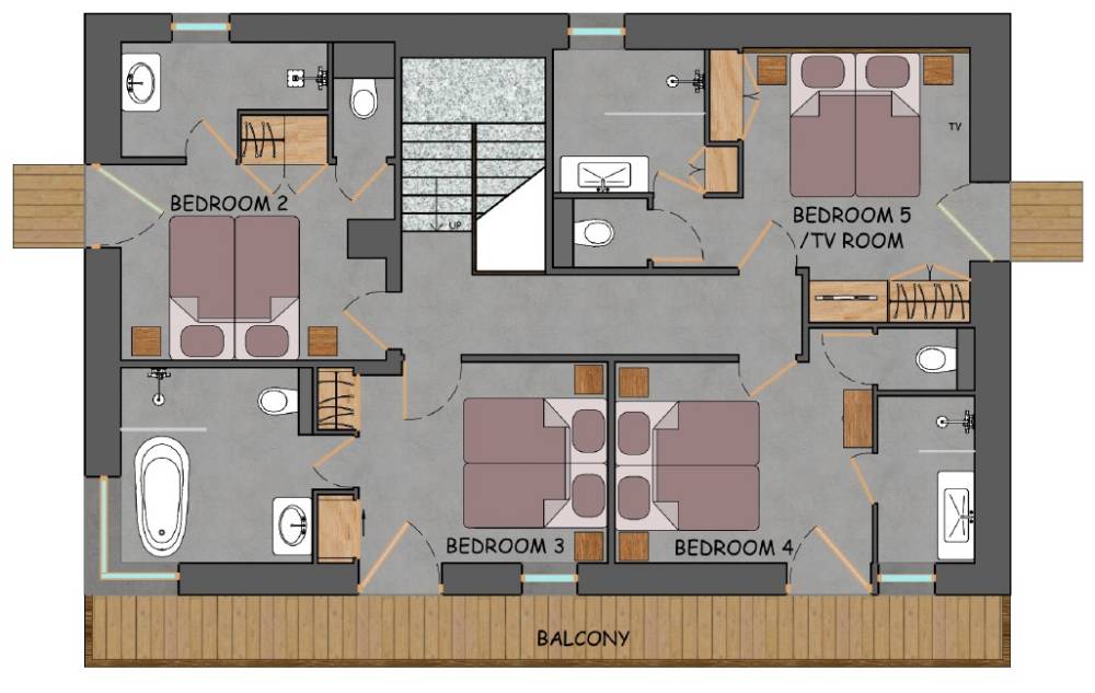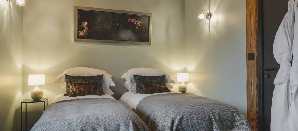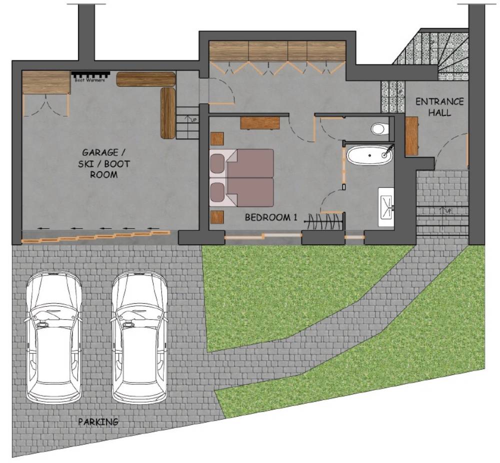On the ground floor is the first twin/double bedroom which also works well for a young family as there are two additional pull out beds that can be used. On the top floor are the other four double bedrooms, three of which can also be arranged with twin beds. The chalet also features a large ski room with boot warmers and outside there is parking for 2 or 3 cars.