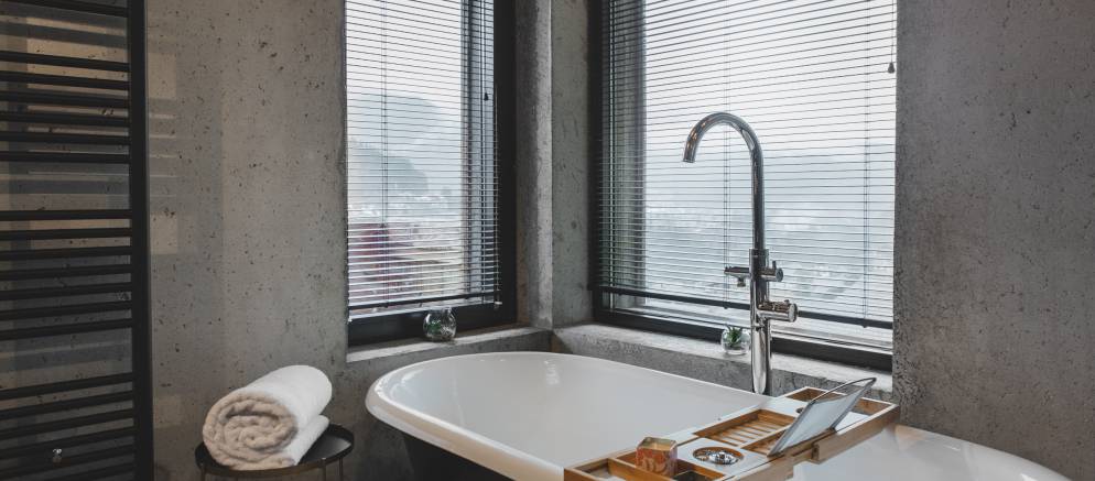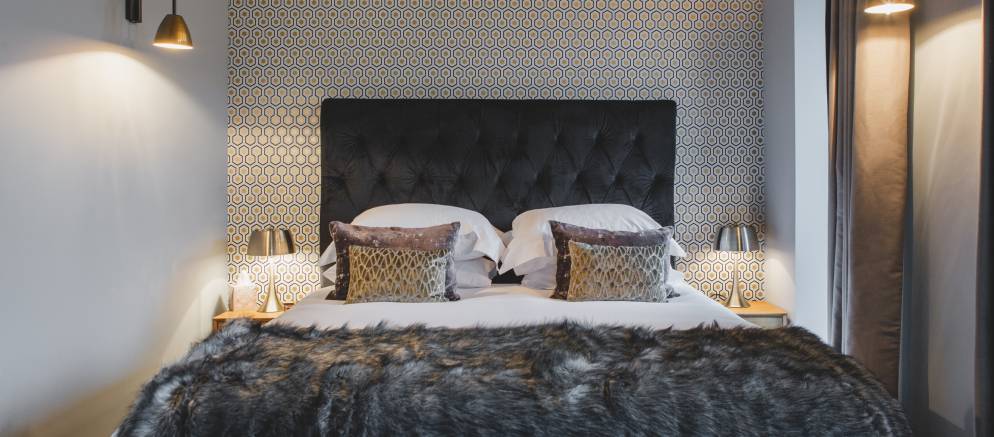 Super king-size double or twin bed with balcony and en-suite bath and shower room.