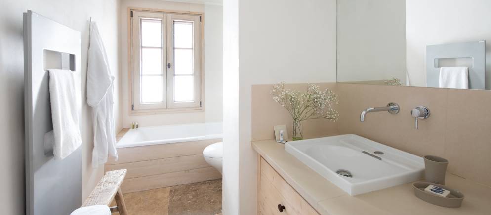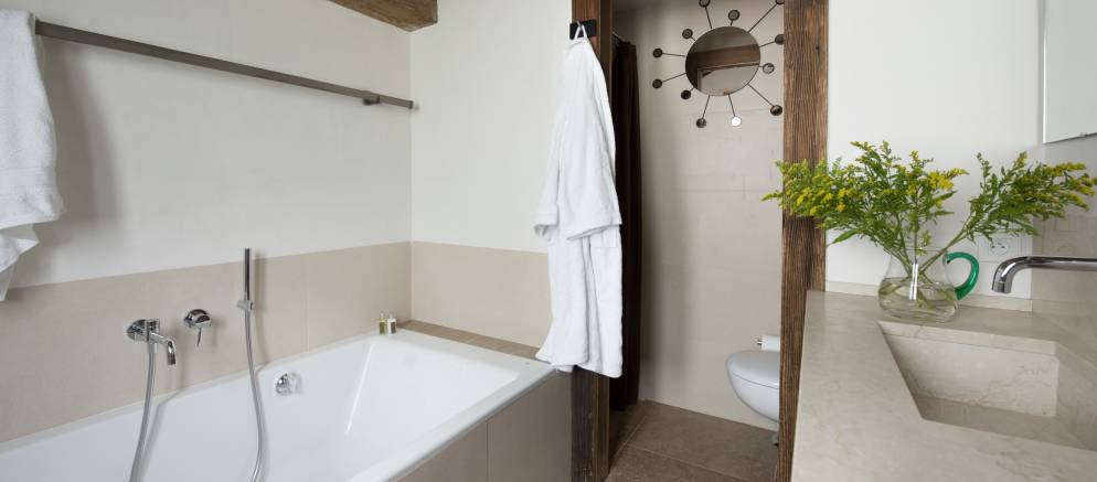 Spacious bedroom (double or twin bed) and sofa (can be used as sofa bed for the two children) with beautiful en-suite with large bath, walk in Italian shower, stone sink and WC.