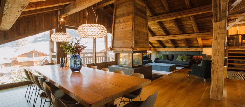 The living space in Chalet Debussy is the ultimate way to enjoy your catered ski holiday experience. Sit by the suspended fireplace while your host serves you a cocktail and your chef prepares mouth-watering canapés.