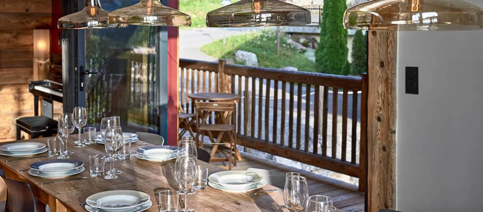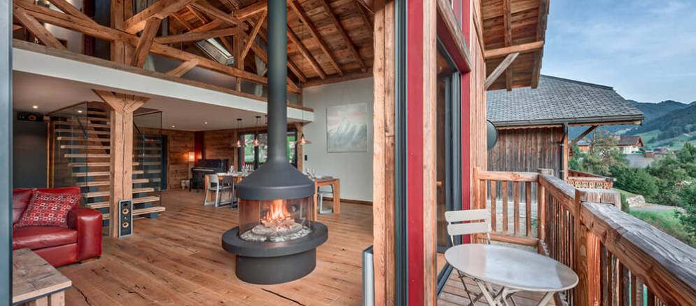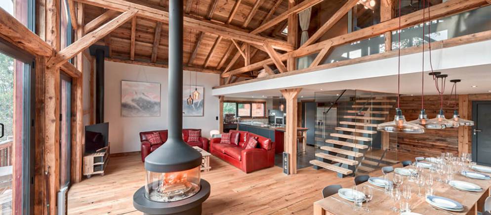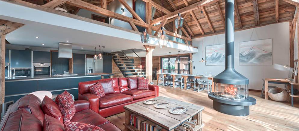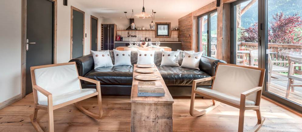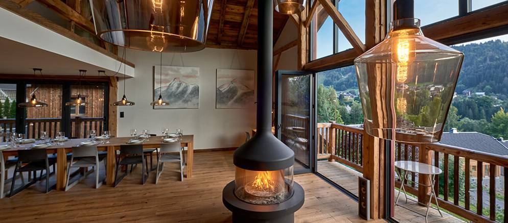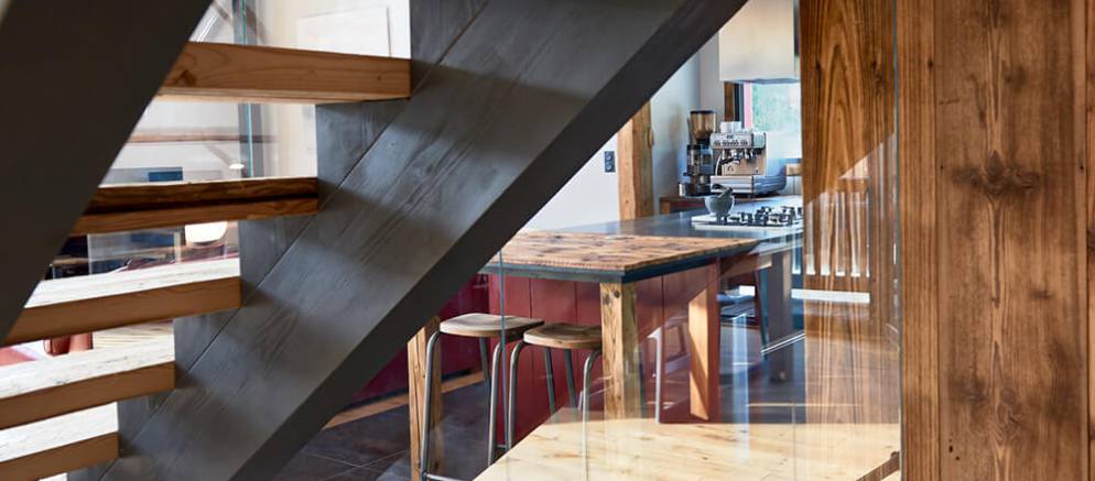 The entrance level of the chalet is a large open plan living, dining and kitchen area that is flooded with light and sunshine through the massive glass fronted wall that looks out to the garden and Parc des Dérêches. The glass doors open on to a balcony that enjoys the sunshine throughout the day and in to the evening. Also taking in this view is the sitting area that surrounds a wood burning stove and a large dining table complete with rocking dining chairs.