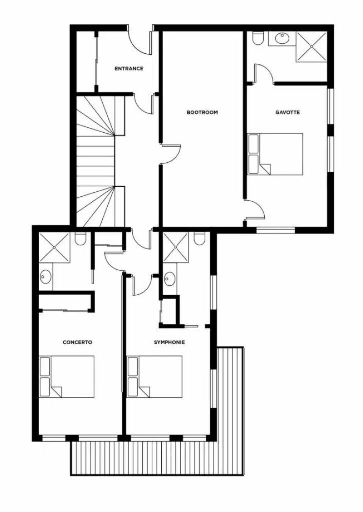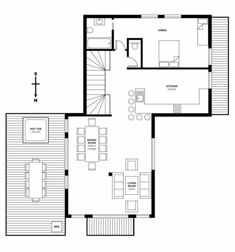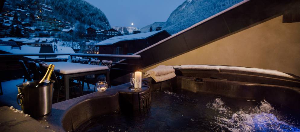 The open plan living space on the top floor benefits from double height ceilings and provides ample space for a group or a couple of families. The large sun deck has an outdoor hot tub for some private après ski relaxation. The chalet is located right next to Chalet Harmonie and can be rented together to give you 11-bedrooms of co-located living space
