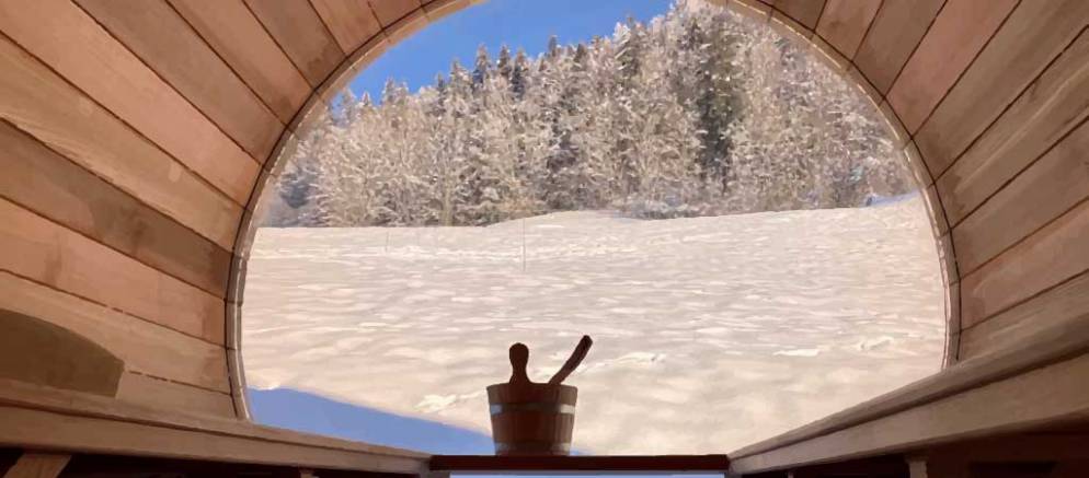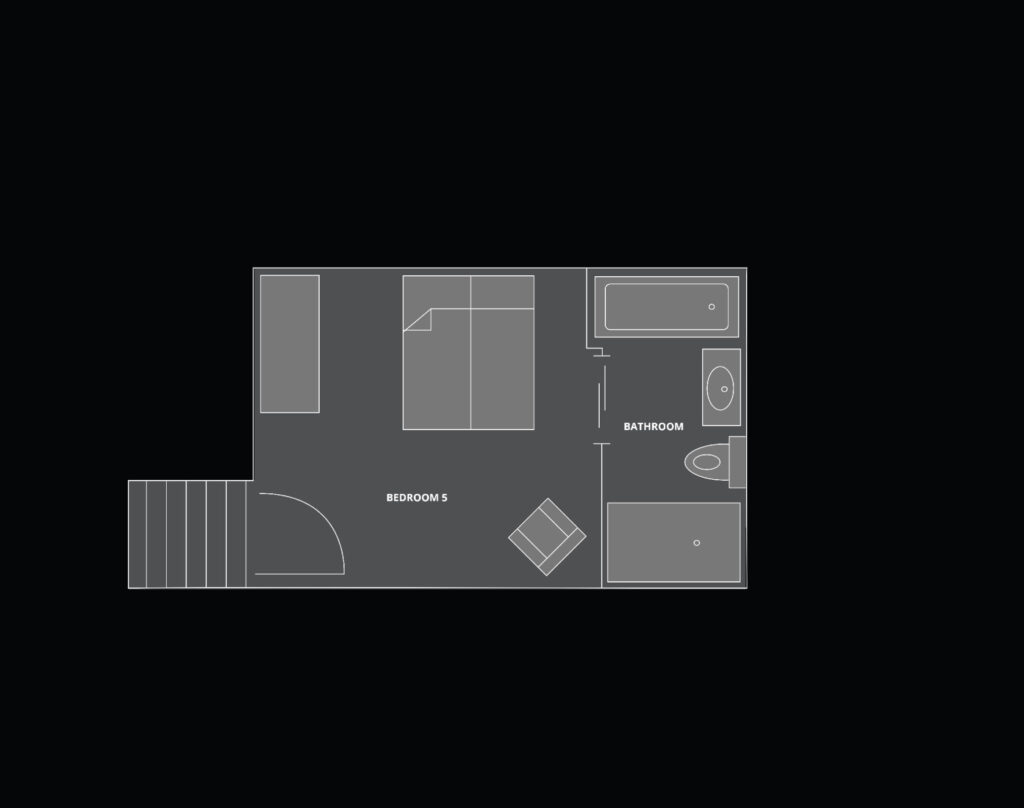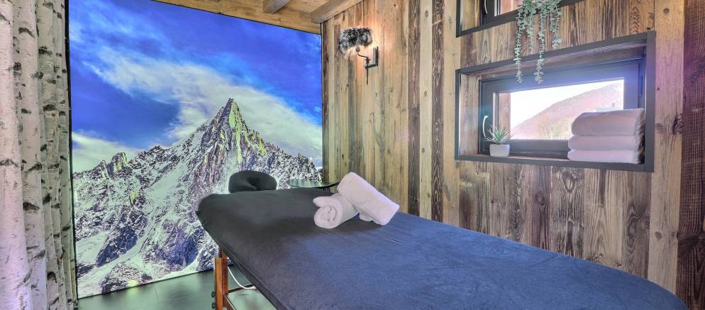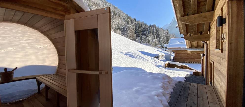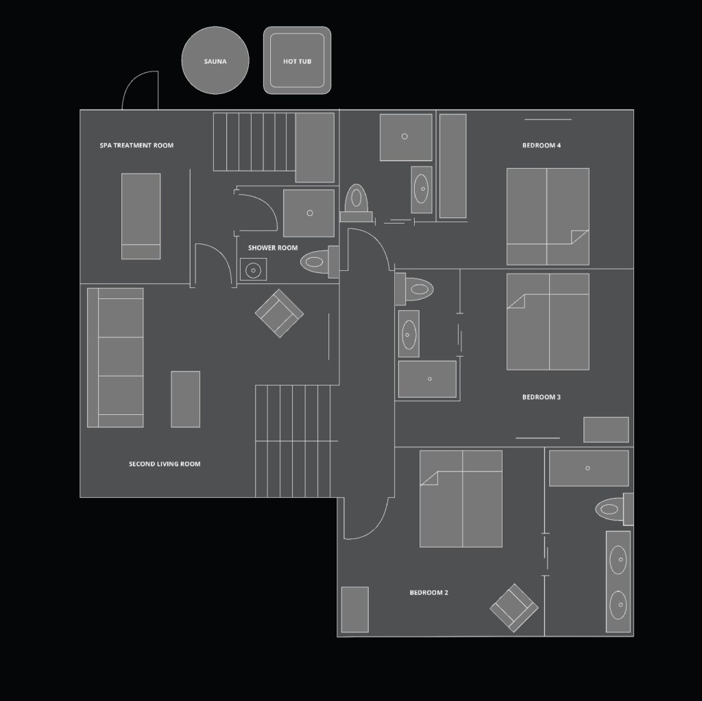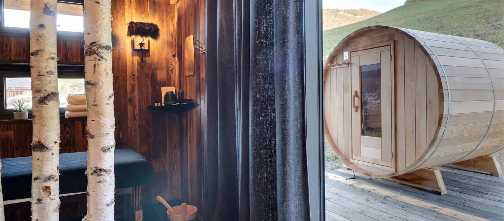 If that is not enough, there is more space to unwind on the third floor where there is a second living room. Curl up here with your favourite holiday book if your eyes are not distracted by the mountain views from the floor-to-ceiling windows. From here head through a hidden door to the wellness area with a massage room and shower, before stepping out to the terrace with outdoor barrel sauna and hot tub, offering views of the forest.