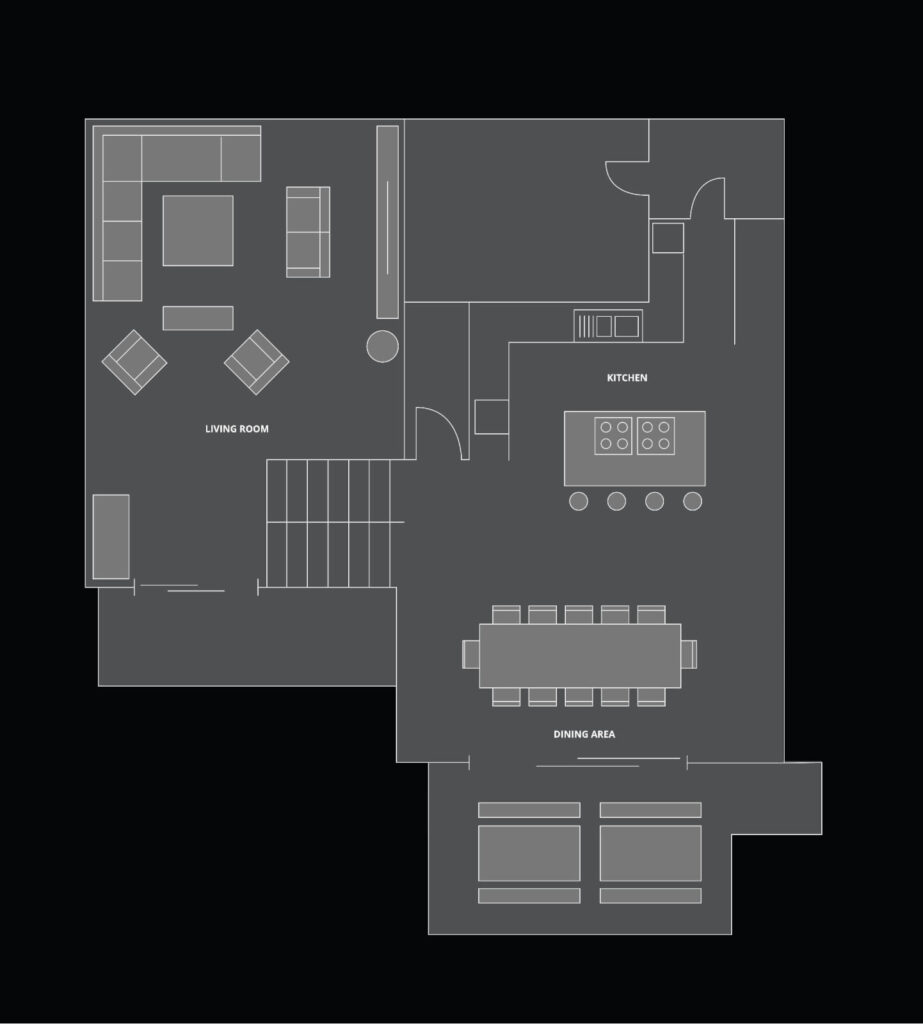 The heart of the chalet is on the second floor, where you’ll find the open-plan kitchen and dining area with a table seating 12 people. The kitchen is fully equipped for home cooking and features an island unit. Half a level up is the lounge area with TV nook, large sofas, and wood burning fireplace. For children and adults alike, there is a selection of board games, and speakers for your playlist.