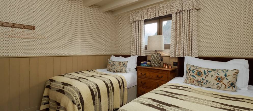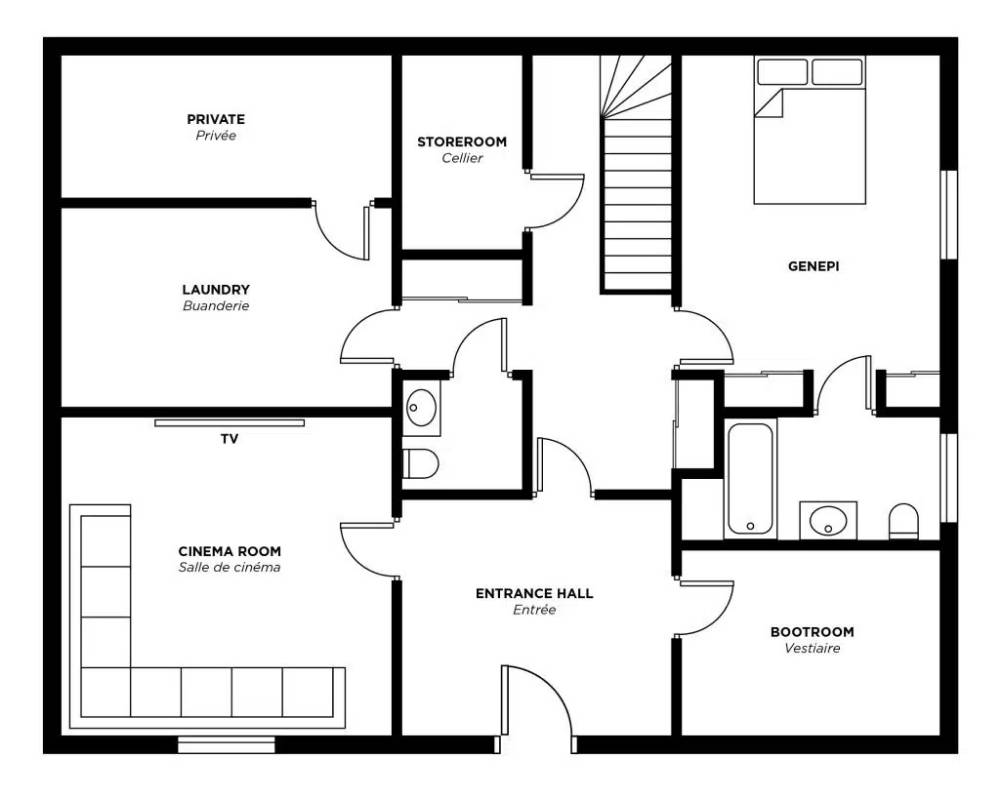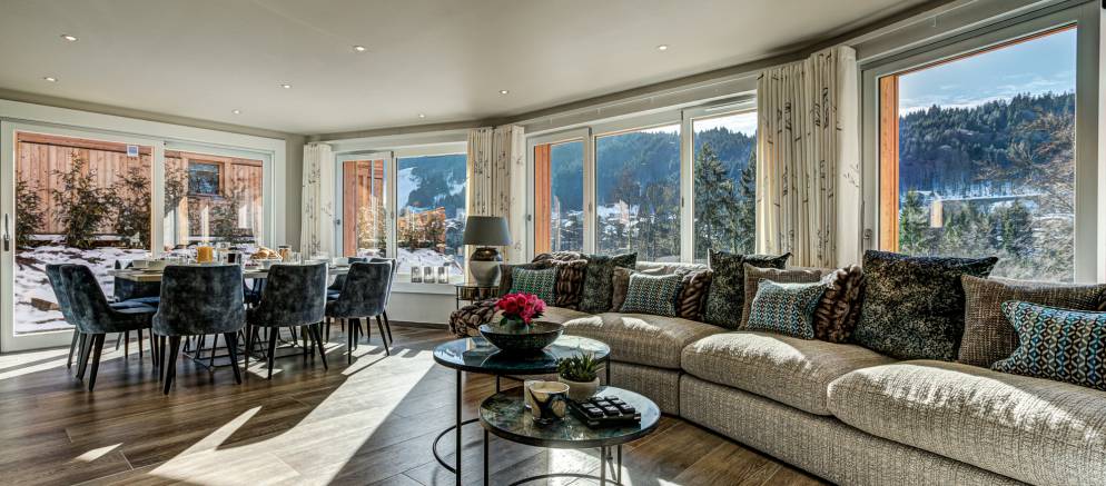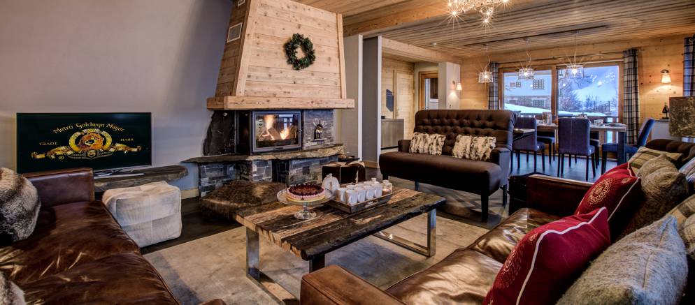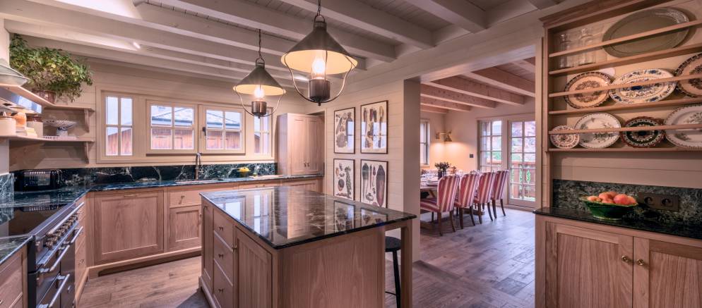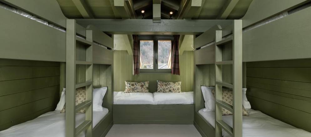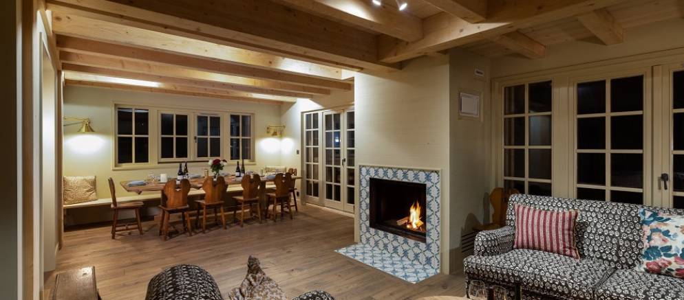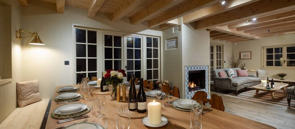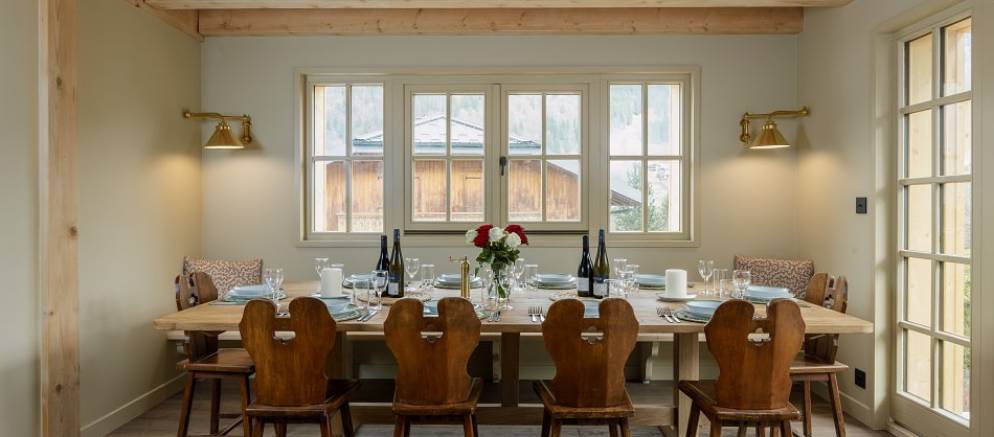 The chalet is arranged over three floors and has 6 en-suite rooms as well as a bunk room for 6 children. Sleeping up to 14 guests, there is flexible rooming configurations for different groups or several families looking to ski holiday together. The gorgeous open living and dining space with views of the local peaks is on the first floor and leads out onto a large terrace with outdoor hot tub.