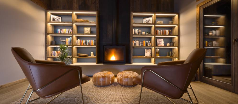 For your own private après ski enjoyment a bar adds another level of fun to this space. The dining area and lounging spaces feel intimate in their open plan environment and great care has been taken to create different and defined areas in which you can relax. The floor is finished off with grand floor to ceiling bookshelves with feature wood burning fireplace nestled between. This is the perfect spot to relax with a book, digestif or just listen to some music through the chalet’s SONOS system.