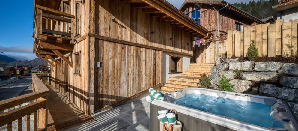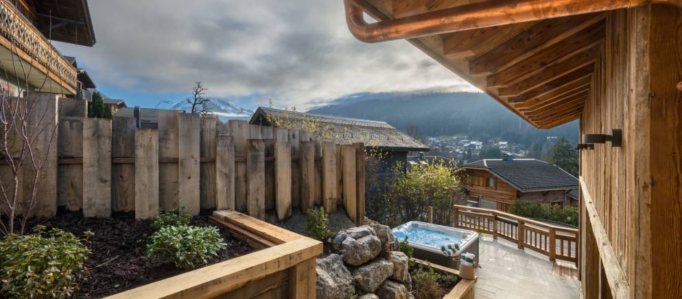 The chalet has been built into the hillside, so from the top floor you can step out of the back door and down some steps onto a decked area with a hot tub.