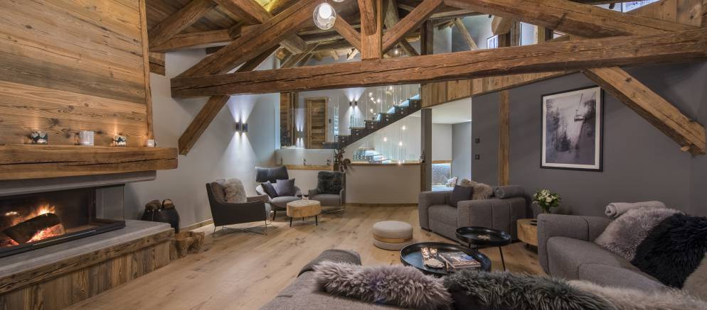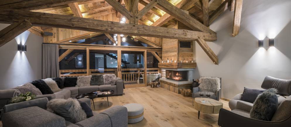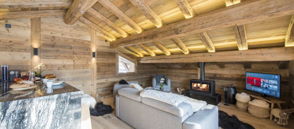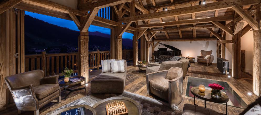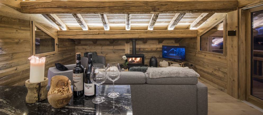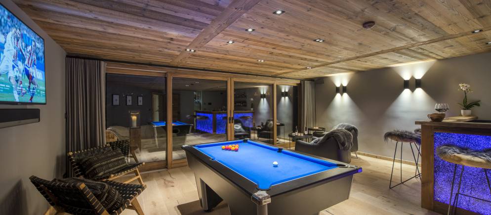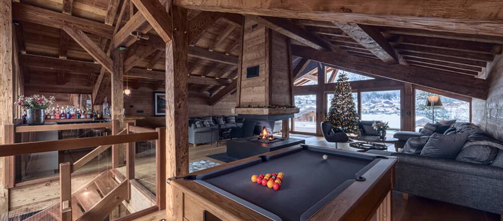 Back inside and the bar, complete with pool table, opens directly onto the large terrace – an incredible spot to watch the sun setting over the mountains. Enjoy a glass of champagne and enjoy the warmth of the sunken fire pit. The main living area features exposed reclaimed wood that brings all the warmth and character of a traditional alpine lodge, but here it is beautifully crafted into a modern luxury ski chalet.