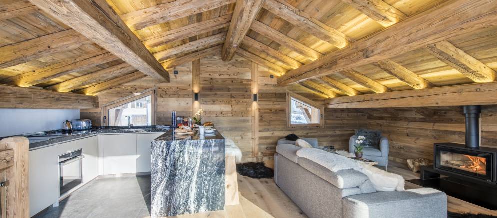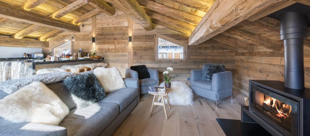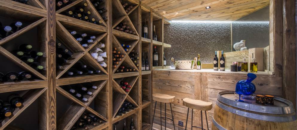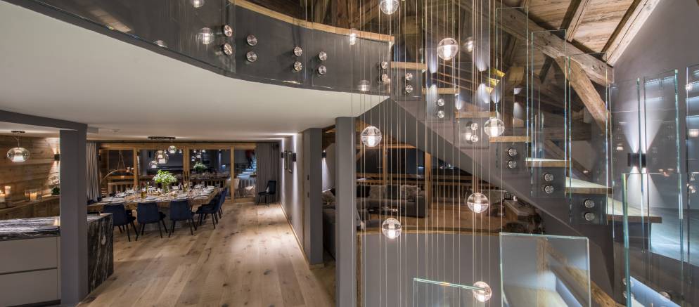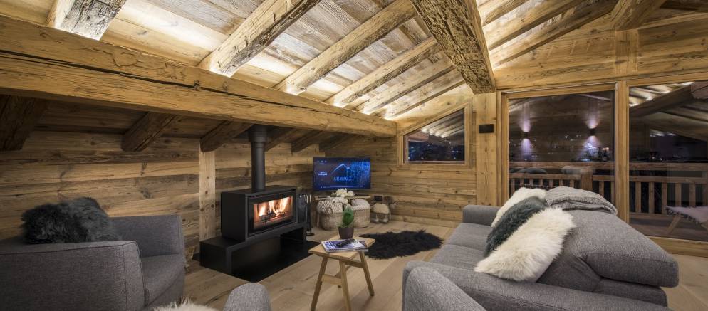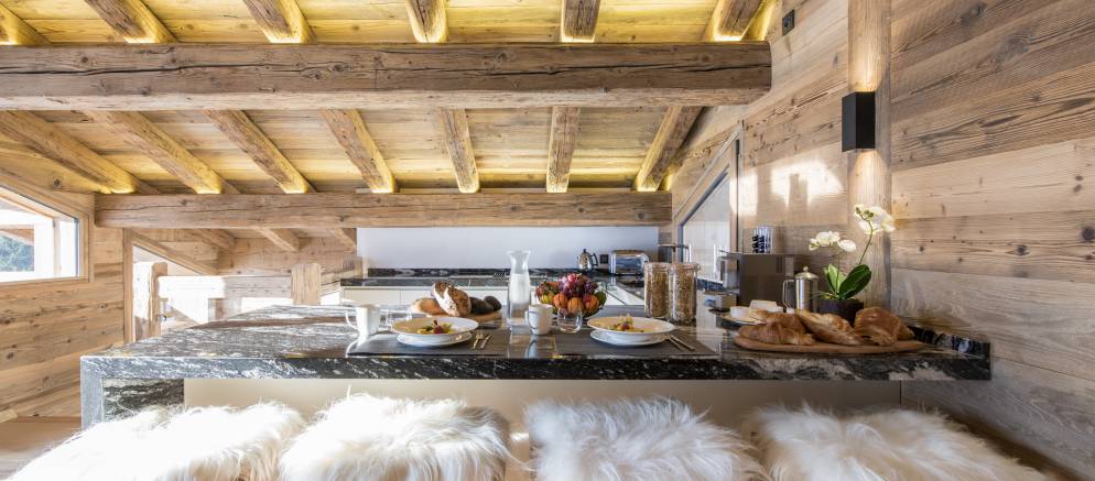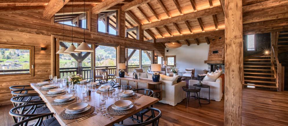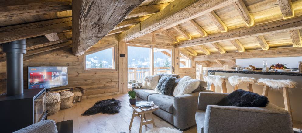 Back inside and the bar, complete with pool table, opens directly onto the large terrace – an incredible spot to watch the sun setting over the mountains. Enjoy a glass of champagne and enjoy the warmth of the sunken fire pit. The main living area features exposed reclaimed wood that brings all the warmth and character of a traditional alpine lodge, but here it is beautifully crafted into a modern luxury ski chalet.