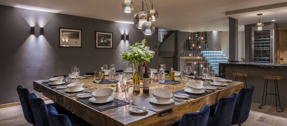 Adjacent to the main living area is the dining room, set around a large handmade Balinese teak table. Here there are more stunning views towards the Pointe de Nyon, this time from an inset balcony. There’s a professional closed kitchen for the ‘serious’ work, and an open show kitchen for service and chef demonstrations.