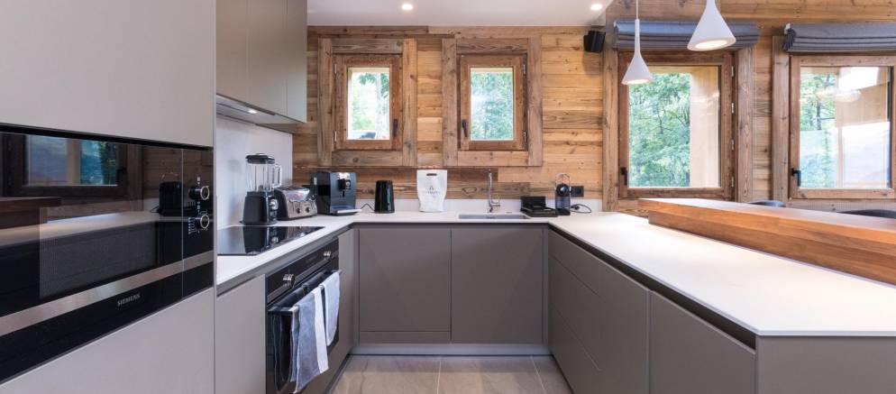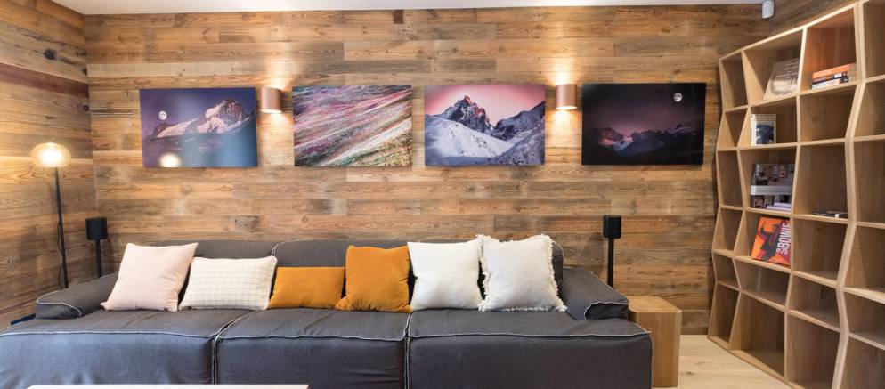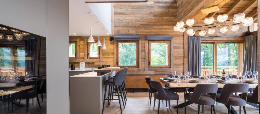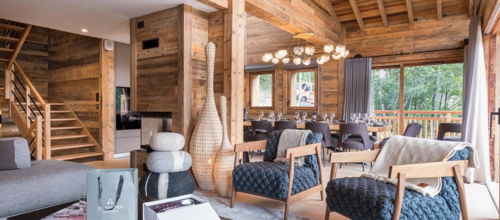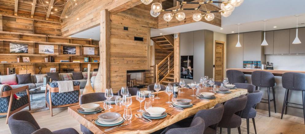 The chalet is arranged over four floors and 298m2 of floor area. The entrance to the chalet is on the top floor, where there is a garage, ski room, and lobby. From here stairs bring you down into the heart of the chalet and the open plan living spaces on the second floor. This floor, with its vaulted ceiling, is filled with natural light from the large windows that open out onto a wide balcony.