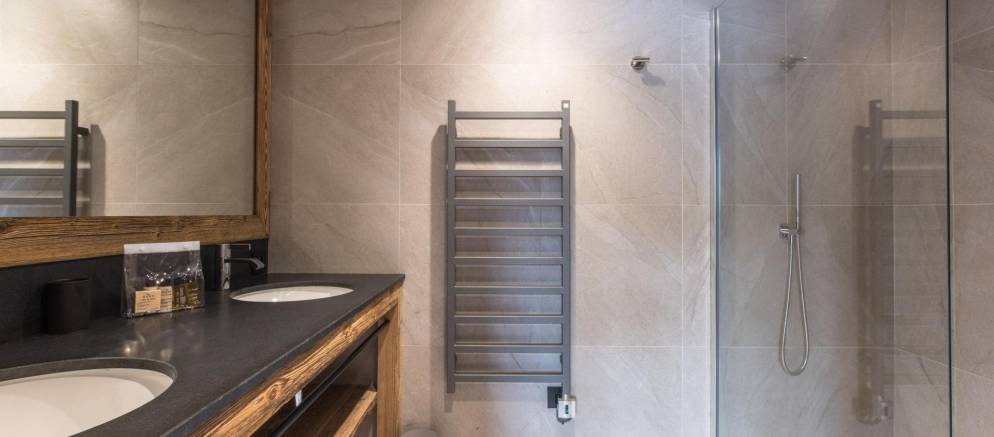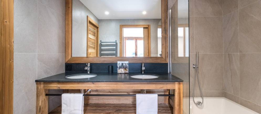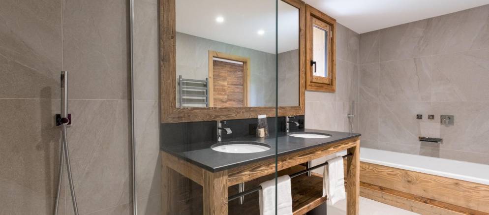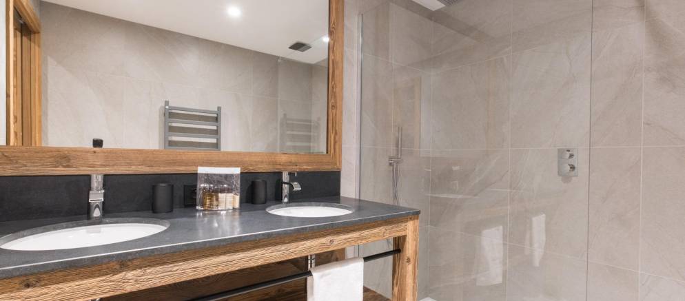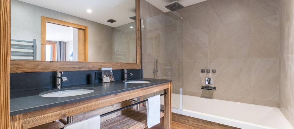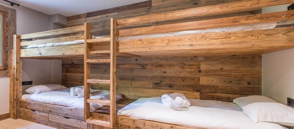 Sleeping up to 10 adults and 5 children, there are six en-suite bedrooms spread across the bottom two floors of the chalet. On the first floor are three double bedrooms, and on the ground floor a further two double bedrooms and a children’s bedroom with 3 bunk beds.