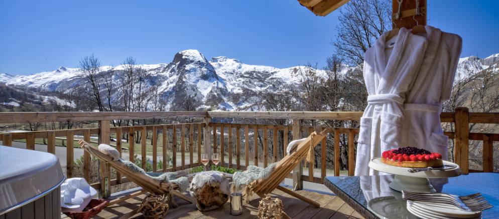 Dining is an elegant but informal affair with candlelight and table linen in the evenings, and this area opens out onto the sun terrace with its panoramic views. There are beautiful wooden deckchairs adorned with sheepskins and an occasional table for those sunny afternoons when you return from the ski slopes, a great place to soak up the alpine sun. It is here that you will also find the outdoor hot tub, which is the perfect place for a glass of après ski fizz.