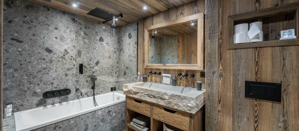 Inside, the mix of stone and wood along with stylish furniture creates the modern yet cosy home for your winter holiday. The open plan living and dining room along with the kitchen are on the top floor, under the impressive wood roof. In the evenings you can unwind by the fireplace or enjoy a pre-dinner drink on the wide balconies that offer great views over the mountains and resort.