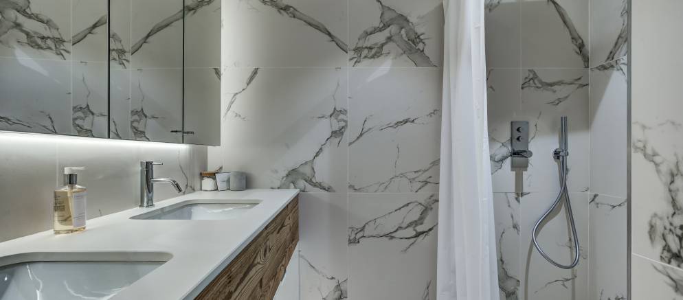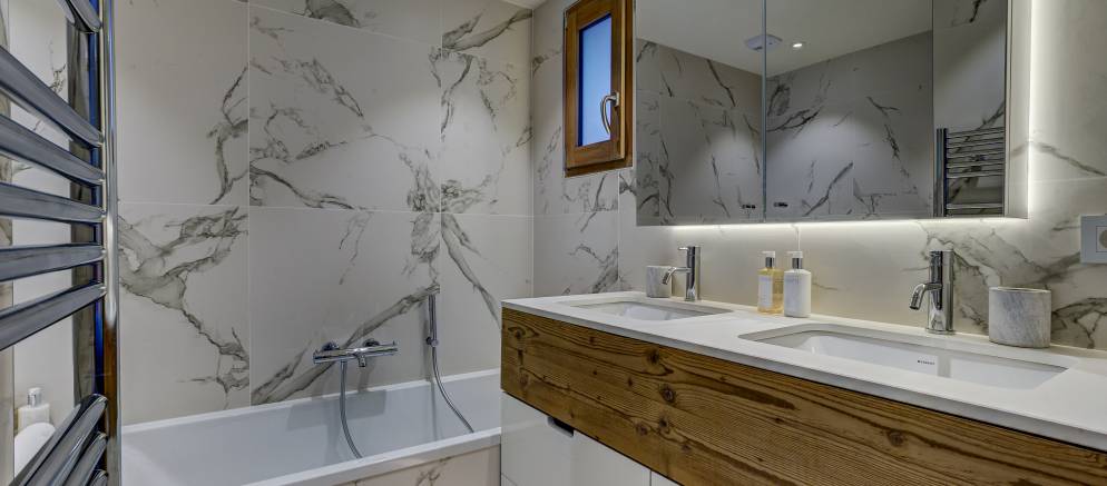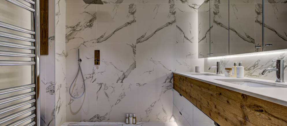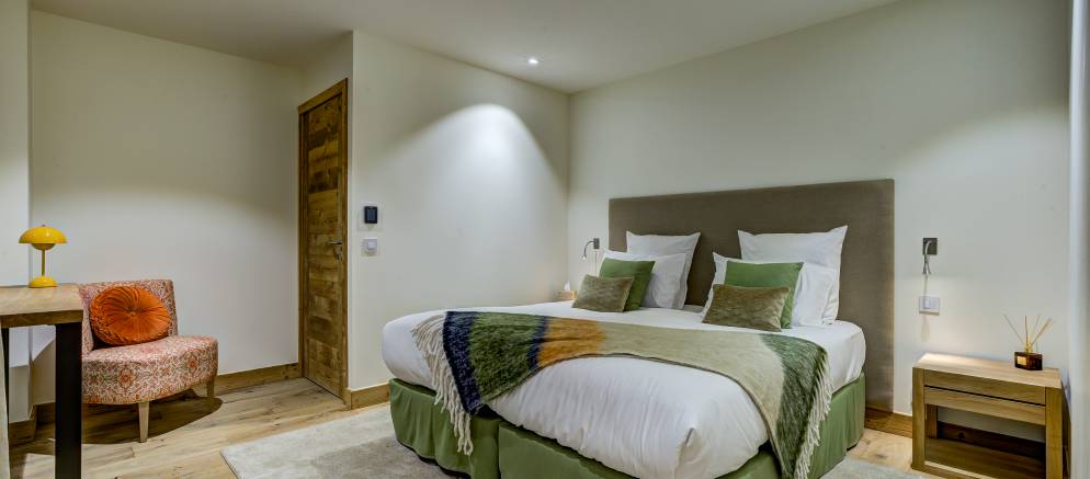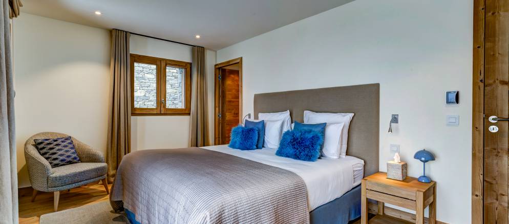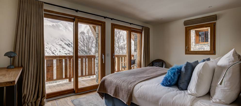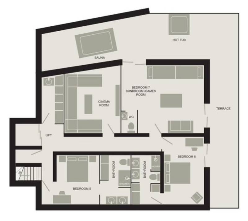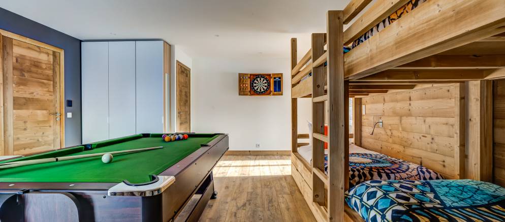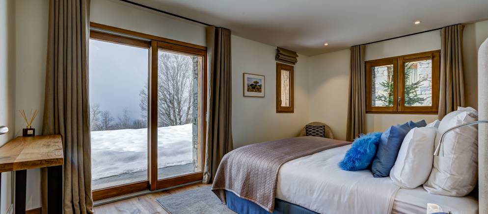Starting at the top of the chalet and the impressive 110m2 open plan living spaces feature a central fireplace, bar, open kitchen, plentiful sofas, and dining table seating 16. Jaw dropping views over the Belleville valley and village of Chatelard, as well as the iconic mountain “Le Cochet” are perfectly framed by the floor to ceiling windows across the entire width of this level.