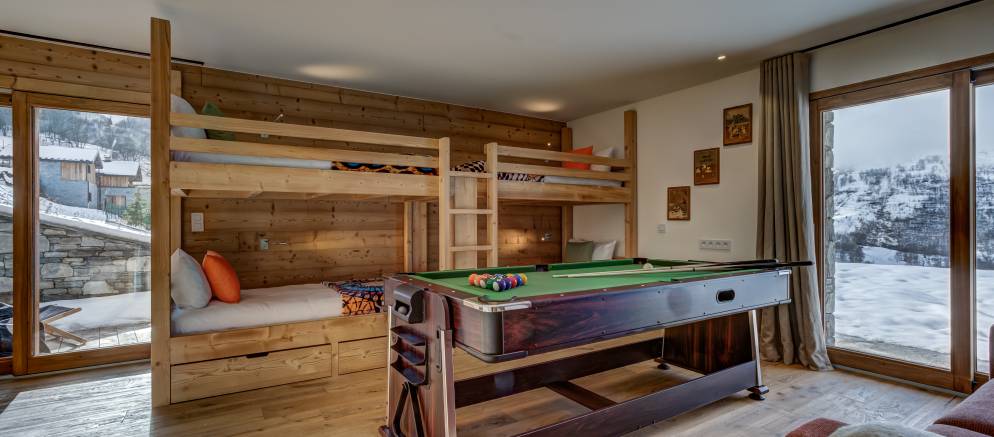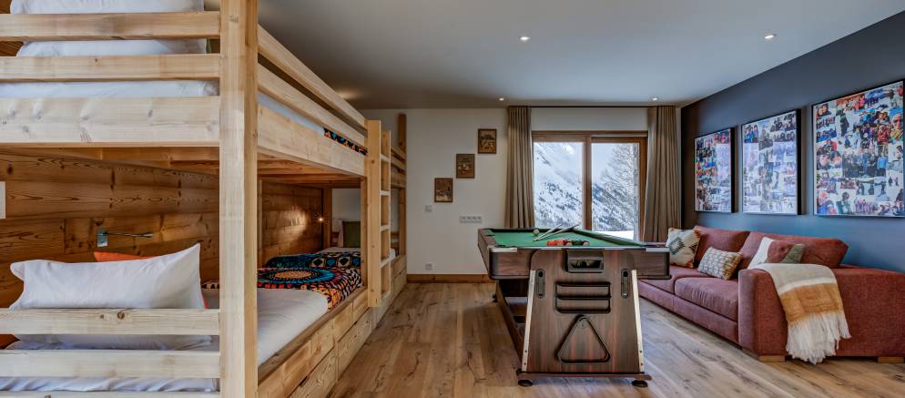 Bunk / games room with quad bunk bed, table football, sofa, and toilet.