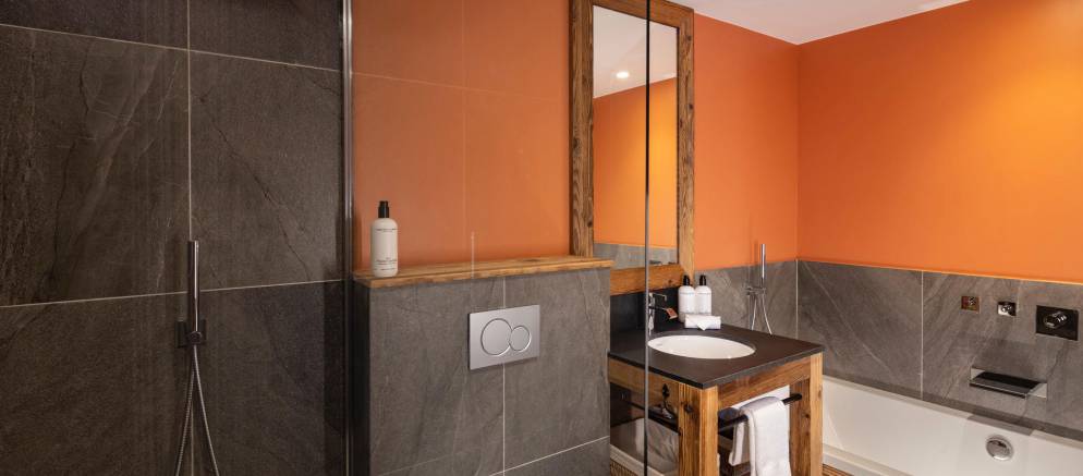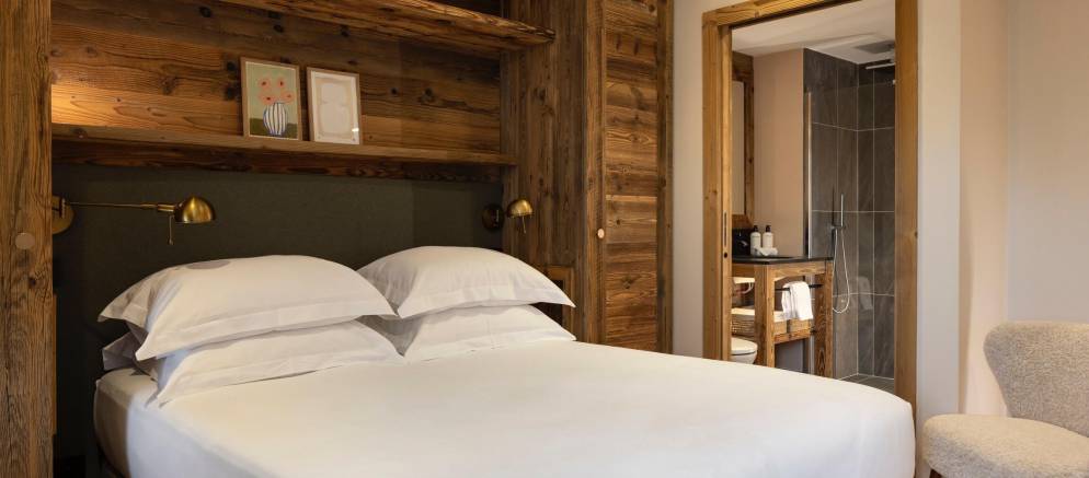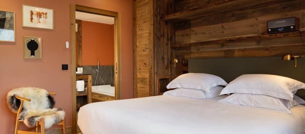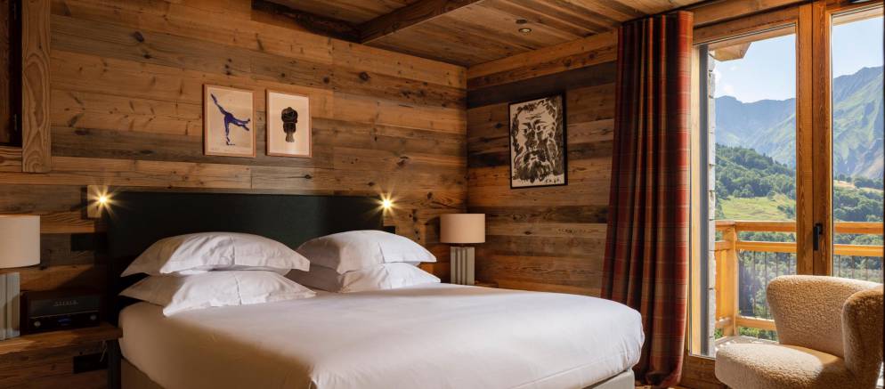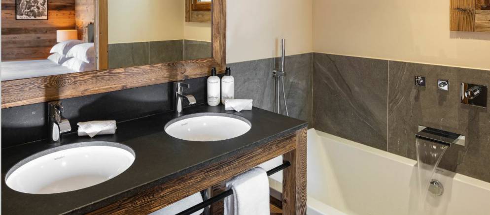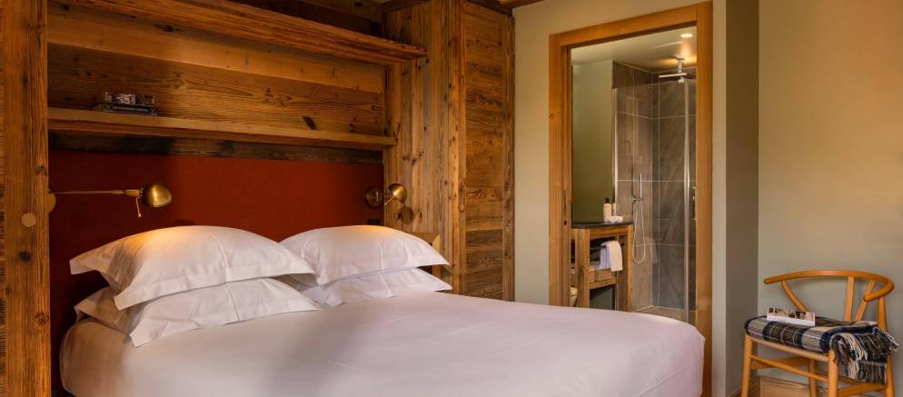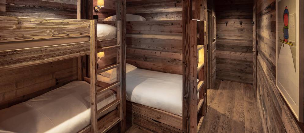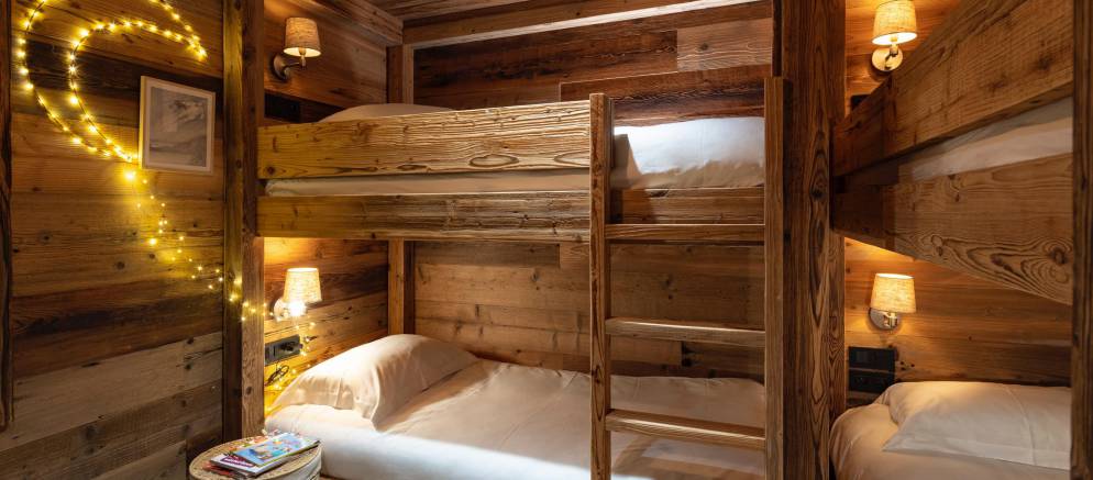 The chalet’s five en-suite bedrooms are spread between the lowest two floors. On the first floor are two double bedrooms including the master, both with balconies, plus a children’s bedroom with 2 bunk beds sleeping up to four. On the ground floor are a further two double bedrooms including a second master bedroom.