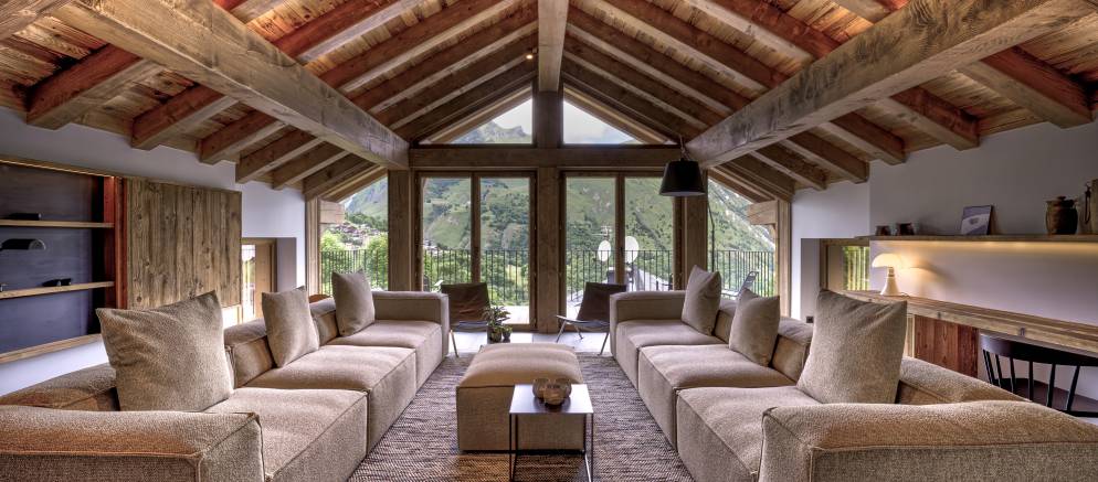 Sleeping up to 12 people, the chalet is arranged over four floors and 200m2 of floor area. The entrance to the chalet is on the top floor, where there is a garage, ski room, and lobby. From here there are stairs that take you down into the heart of the chalet and the open plan living spaces on the second floor. This floor is filled with natural light from the large windows that open out onto a wide balcony.