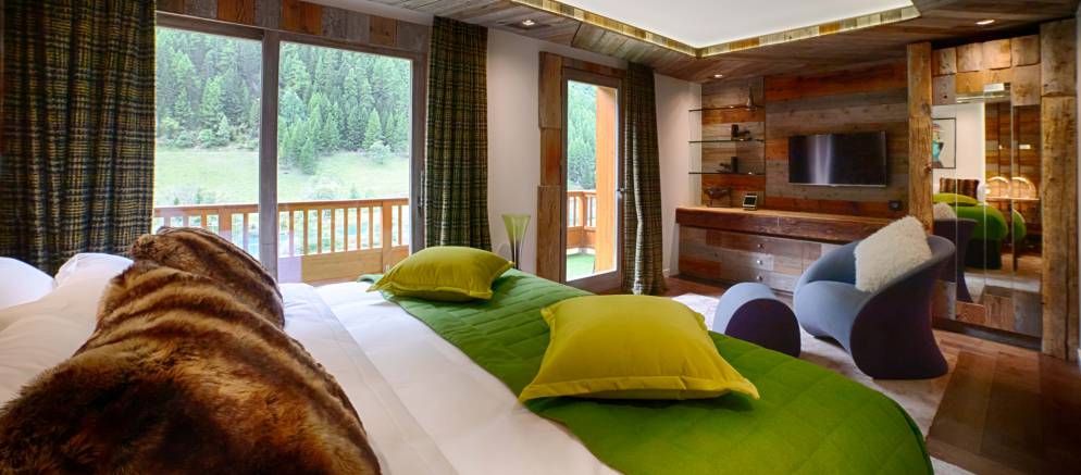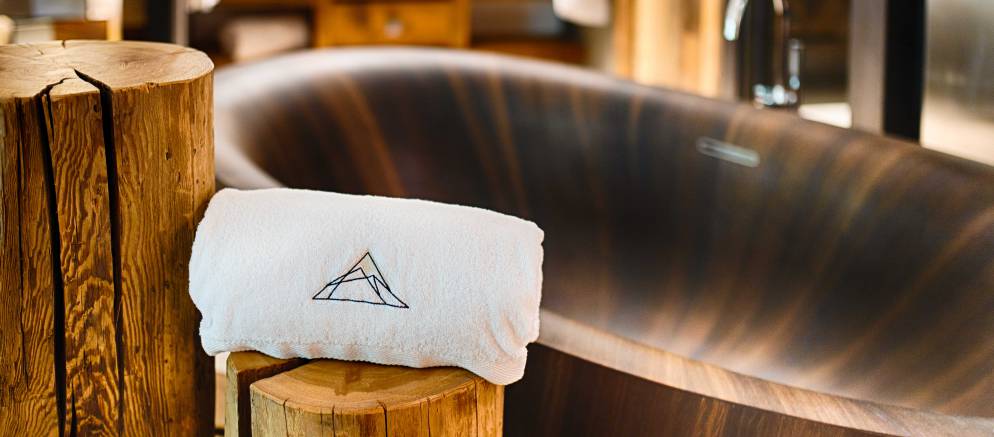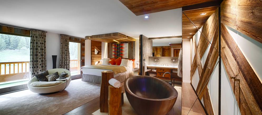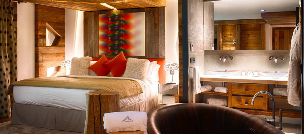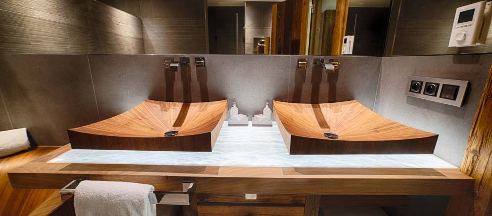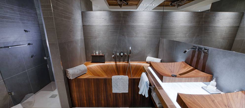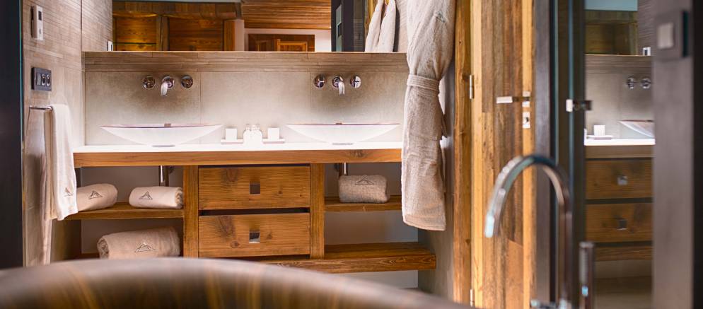 The apartment has four bedrooms and can sleep 6 adults and 3 children. The bedrooms are arranged over the lower level of the apartment. The master suite is an absolute haven of space and tranquillity with a large double bed and fabulous in-room wooden bath, as well as an en-suite shower. There is a further double en-suite room as well as a family suite with double bedroom, bunk room sleeping three and a private bath and shower room.