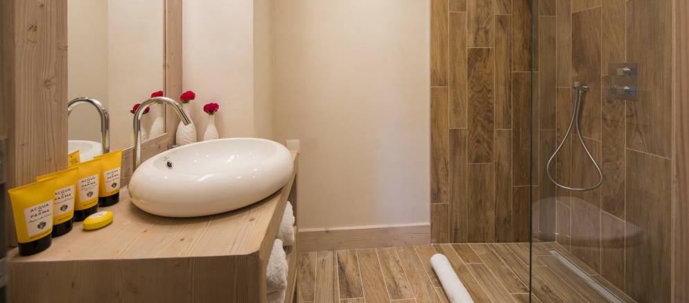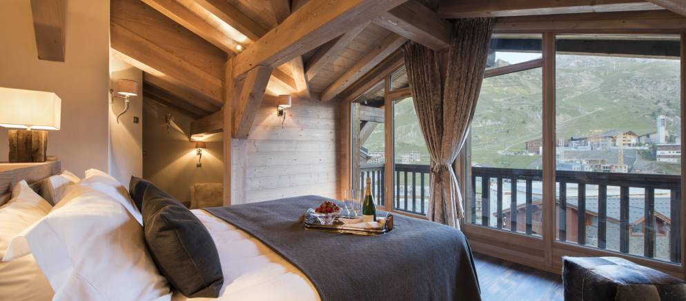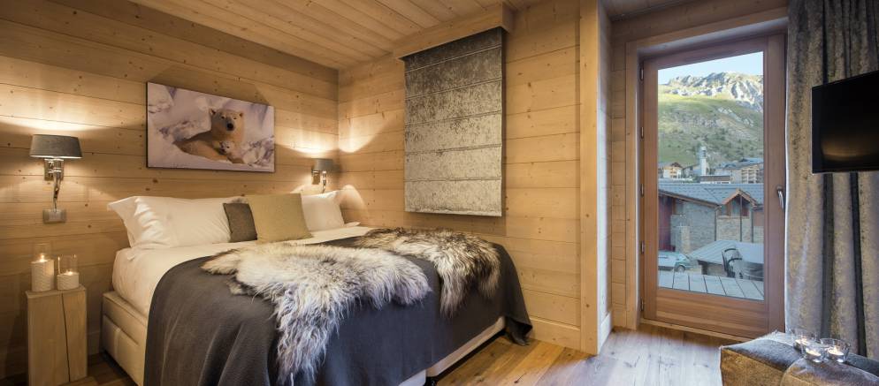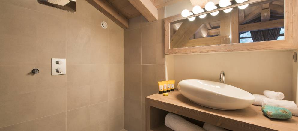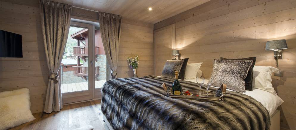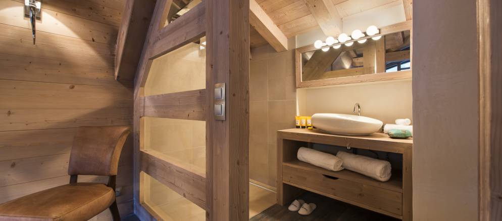 Chalet Ambre’s top floor is home to the impressive master suite, with en-suite shower room and separate toilet. Floor to ceiling French windows open out onto a private balcony, allowing light to flood in. This room also has an additional single bed so is perfect as a family suite.